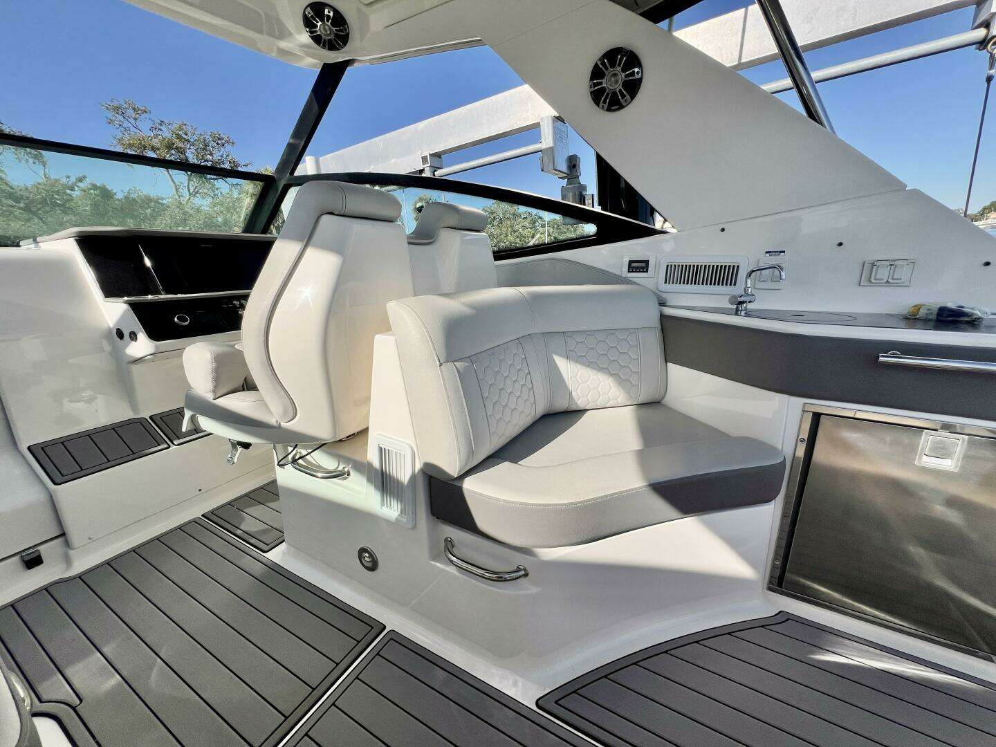 The spacious and luxurious cockpit features EVA decking throughout, high quality marine vinyl with stitched details, full wet bar with fridge and grill, adjustable aft seating for lounge option, and beautiful teak accent cocktail table.