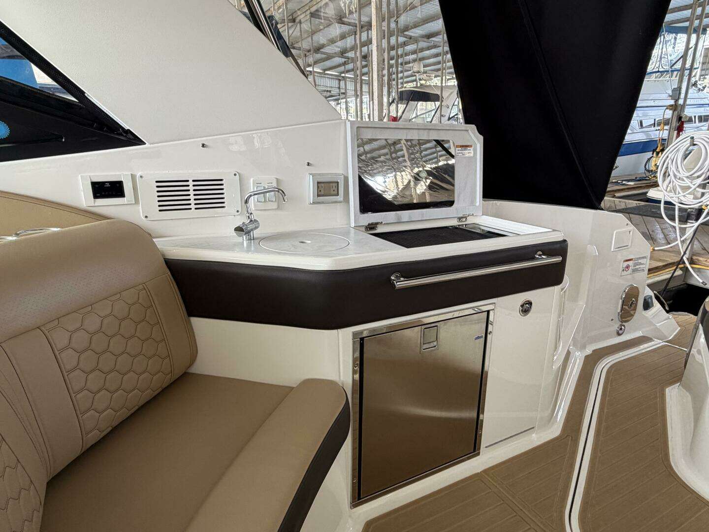 This is a one owner boat that has been kept here on B-dock since new. It only has 82hrs on twin 350hp Axius merc’s. This boat shows like a new one!