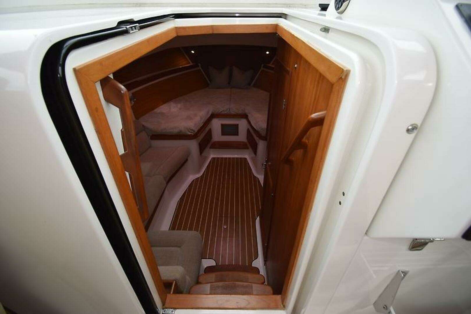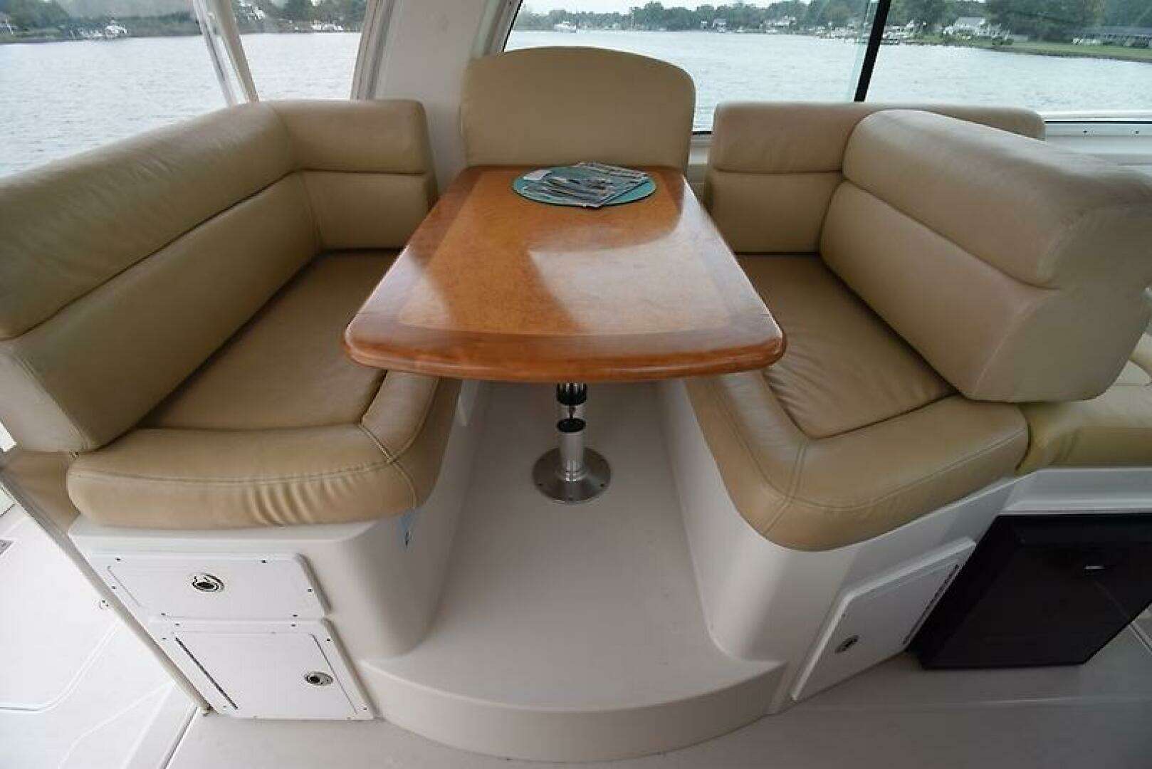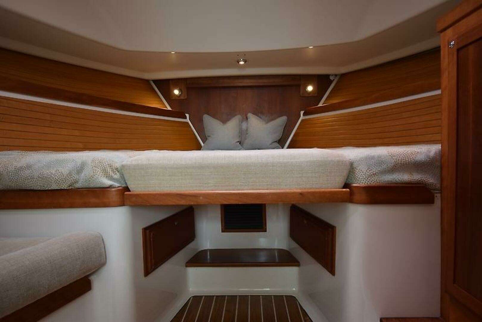 The Back Cove 33 (called the Back Cove 34 in 2012) is a handsome Downeast cruiser whose single-diesel efficiency, versatile layout, and leading-edge construction made her one of the more appealing boats in her class. Like all Back Cove models, the 33 rides on a vacuum-bagged, PVC-cored hull with a reverse transom and a shallow prop pocket. The layout is as simple as it is elegant; a large bench seat in the cockpit and raised dinette on the semi-enclosed bridge deck provide seating for family and friends. Note that the in-line galley is positioned behind the helm, opposite the dinette, rather than in the cabin. The entire bridge deck lifts on hydraulic rams for engine access. Belowdecks is a large and comfortable V-berth forward, convertible L-settee with a inlaid teak table to port, and a large head with separate stall shower to starboard. The cabin is finished with varnished cherry joinery, premium hardware, and an elegant teak and holly sole. Wide side decks are a plus, and a Stidd helm chair and bow/ stern thrusters are standard.