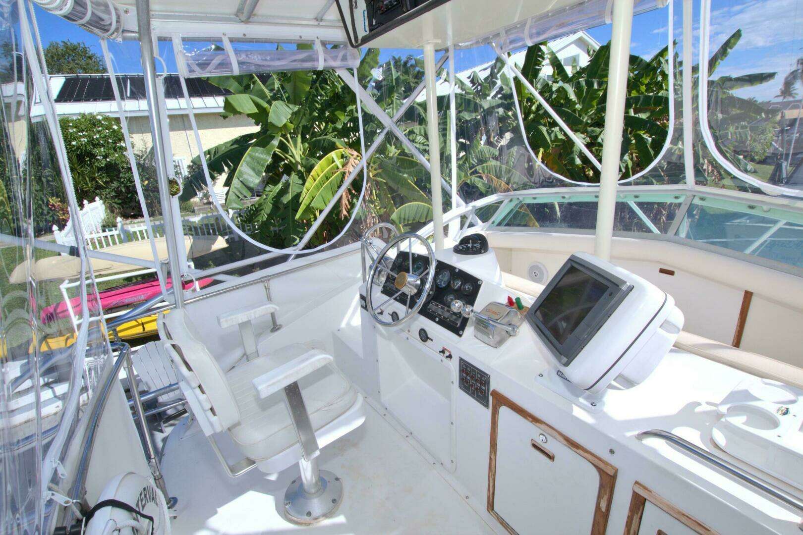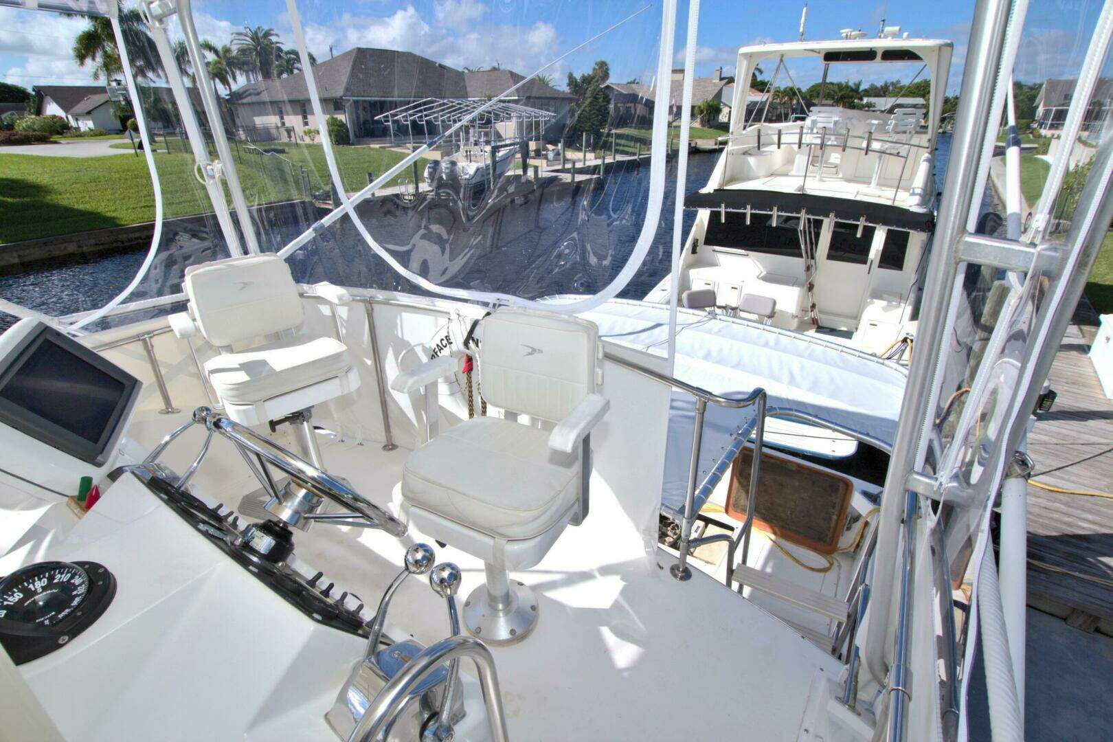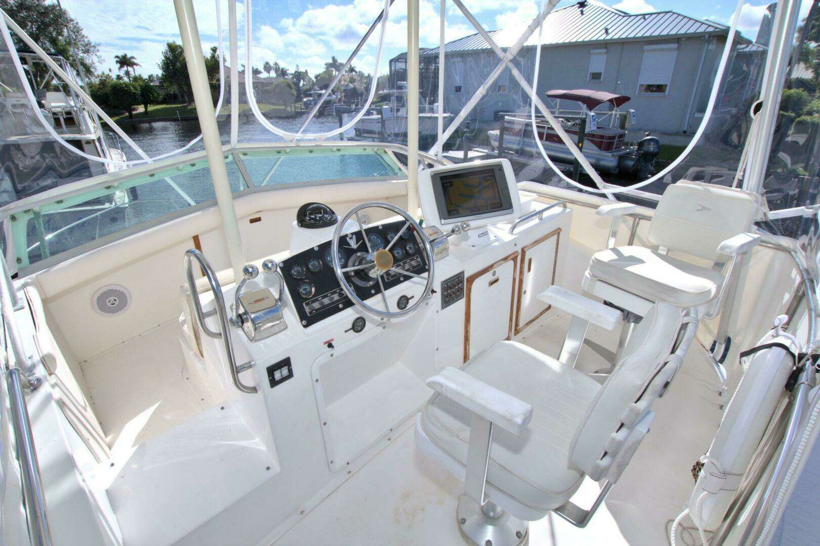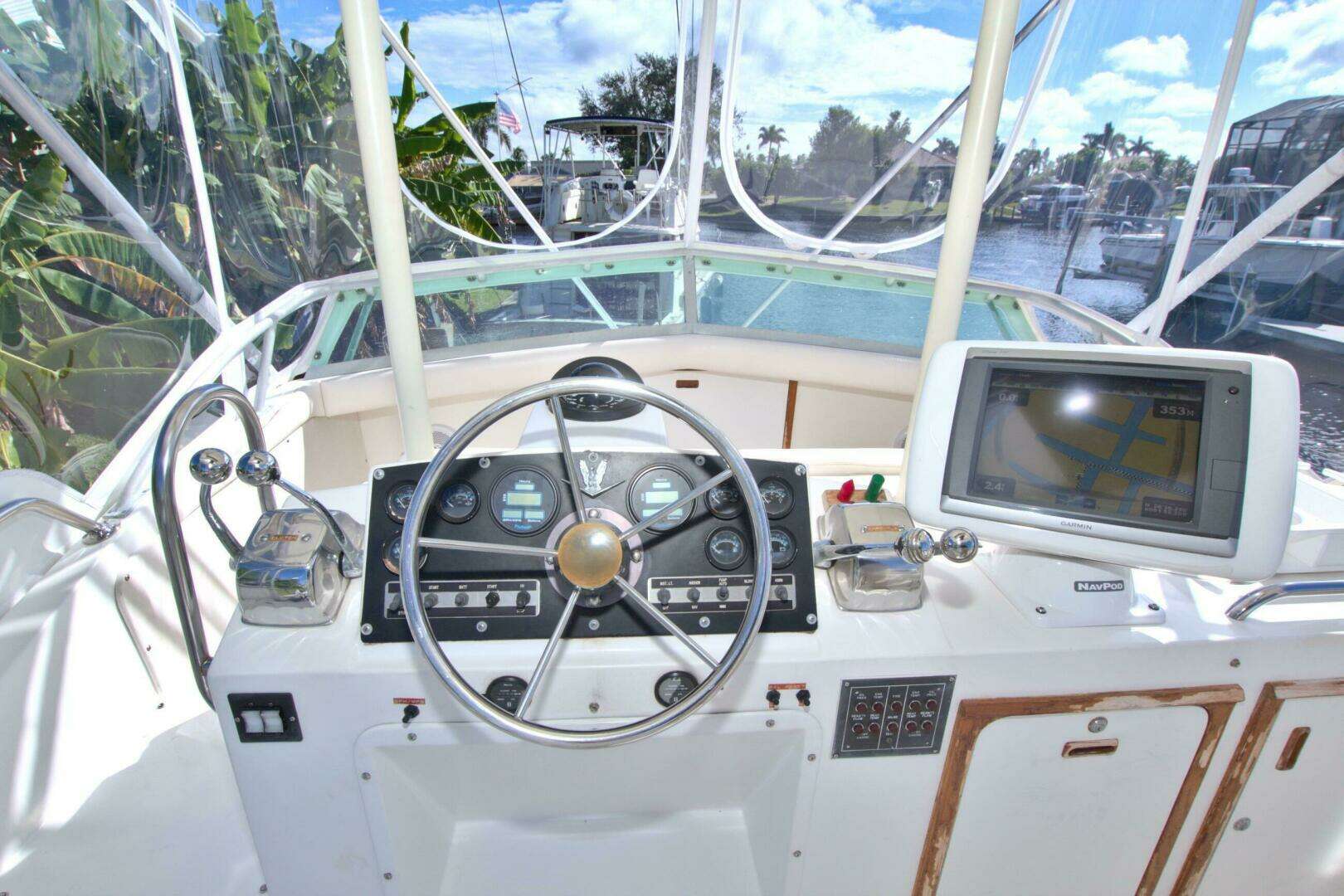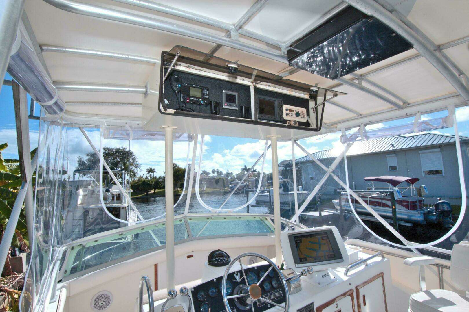 - Cockpit & Deck: Outriggers, rod holders, Glastech swim platform, rigid bimini with enclosure, in-deck storage