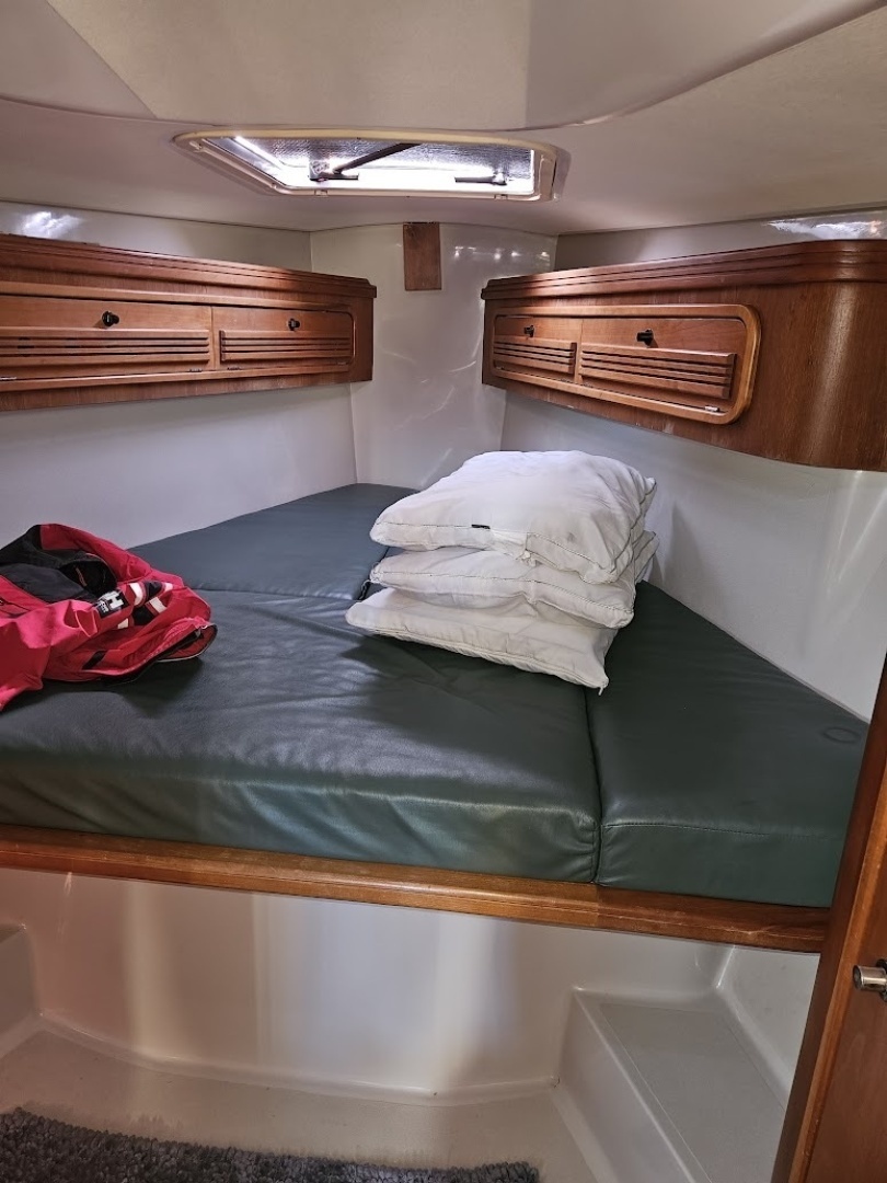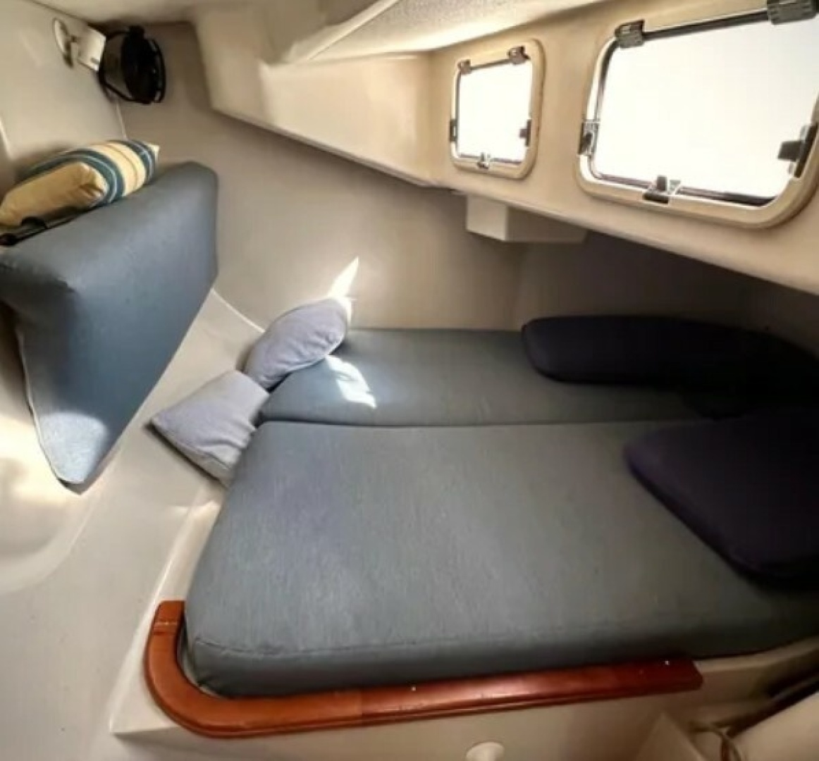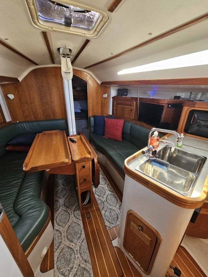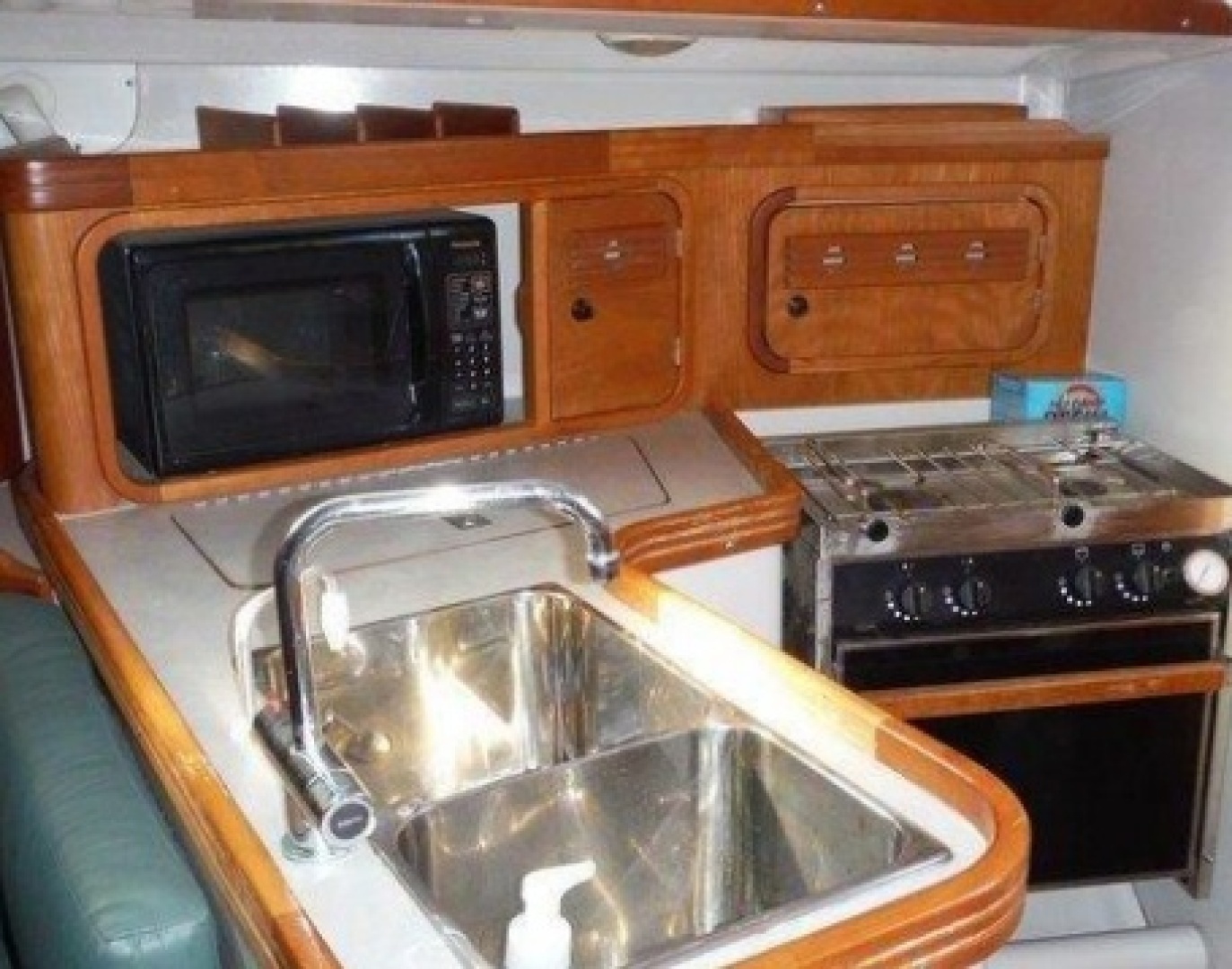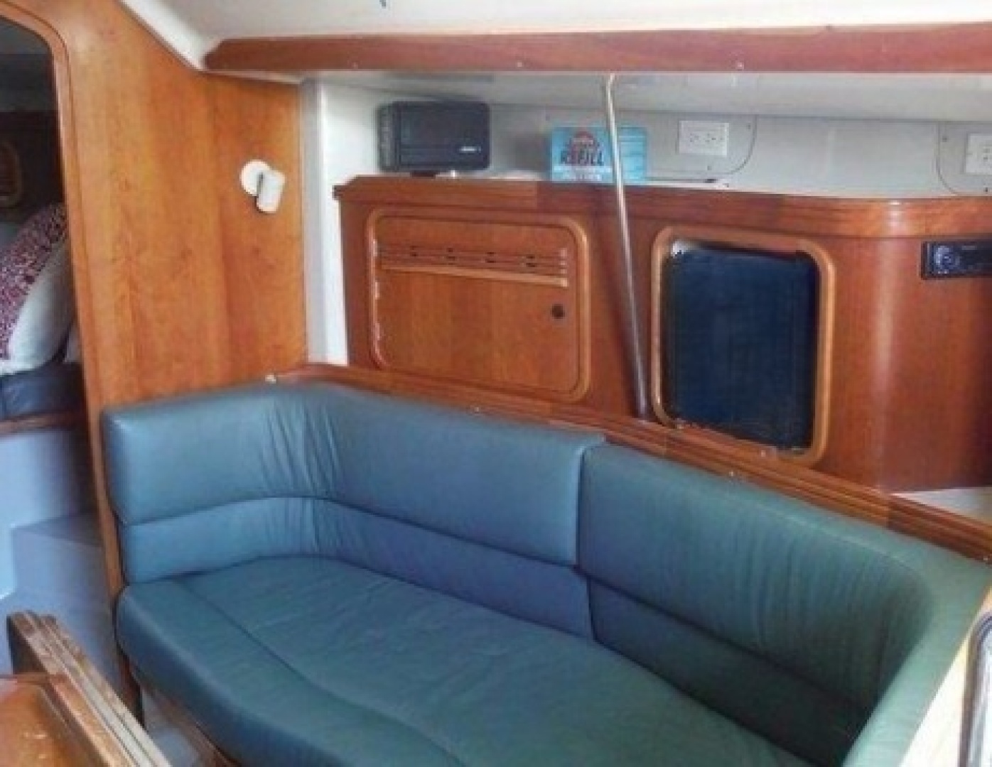 The interior of the C&C 110 is a light varnished cherry with a teak and holly cabin sole. Forward V berth has storage shelves and hanging locker with additional storage under the V berth. The main salon has curved settees port and starboard with a centerline drop-leaf table for dining. At the aft end of port settee is the nav station with an L shaped galley opposite. The head is to port at the base of the companionway and has a large separate shower stall. The private aft cabin is to starboard with a double berth and space to sit up and read as well as standing room for changing clothes. There is a hanging locker and storage under the berth and there are 2 port-windows and a hatch for plenty of ventilation.