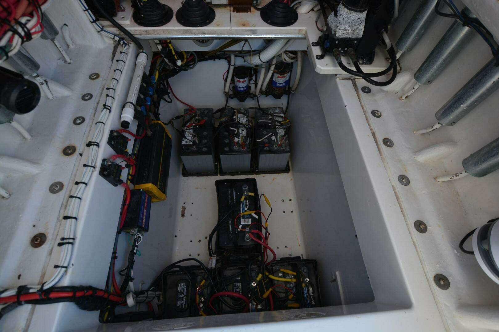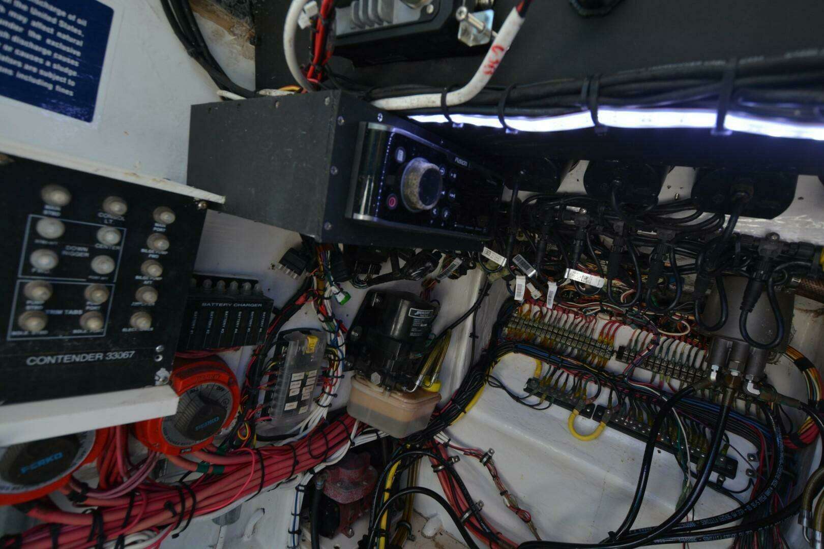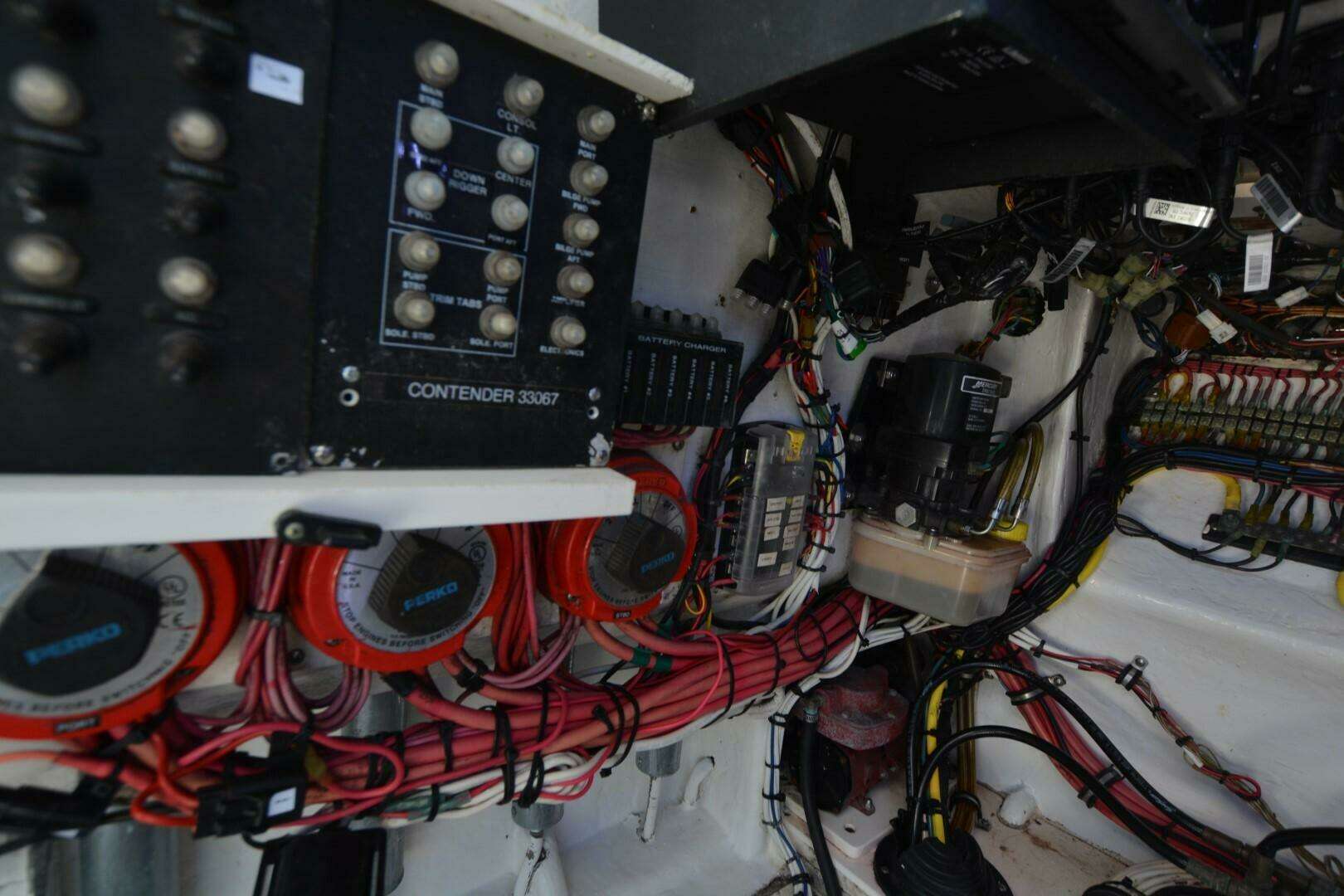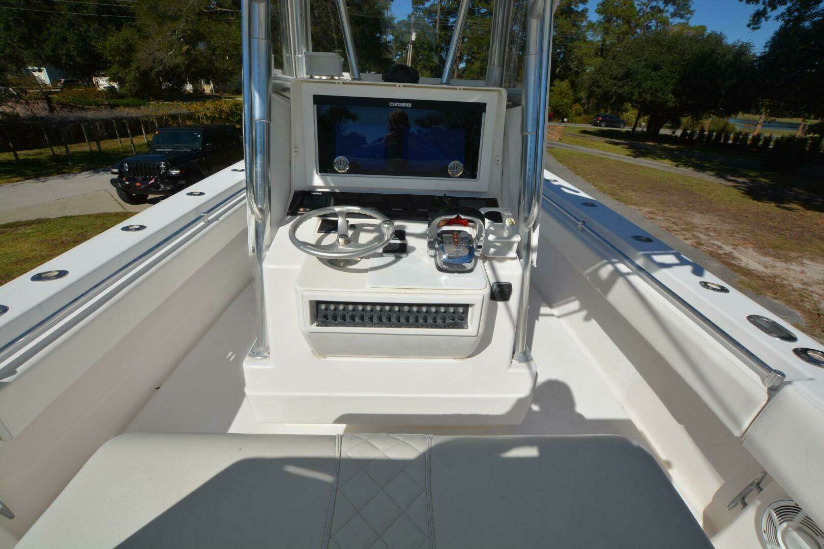 One of Contenders true battle wagons. This is a nice example of a non-stepped hull, triple engine beast. She will cruise at 38 mph, 4100 rpm at 1.37 mpg. She has been upgraded with new Rhodan Trolling Motor, Leaning Post with sliding cooler below and Live Wells in transom, aft deck and forward deck.