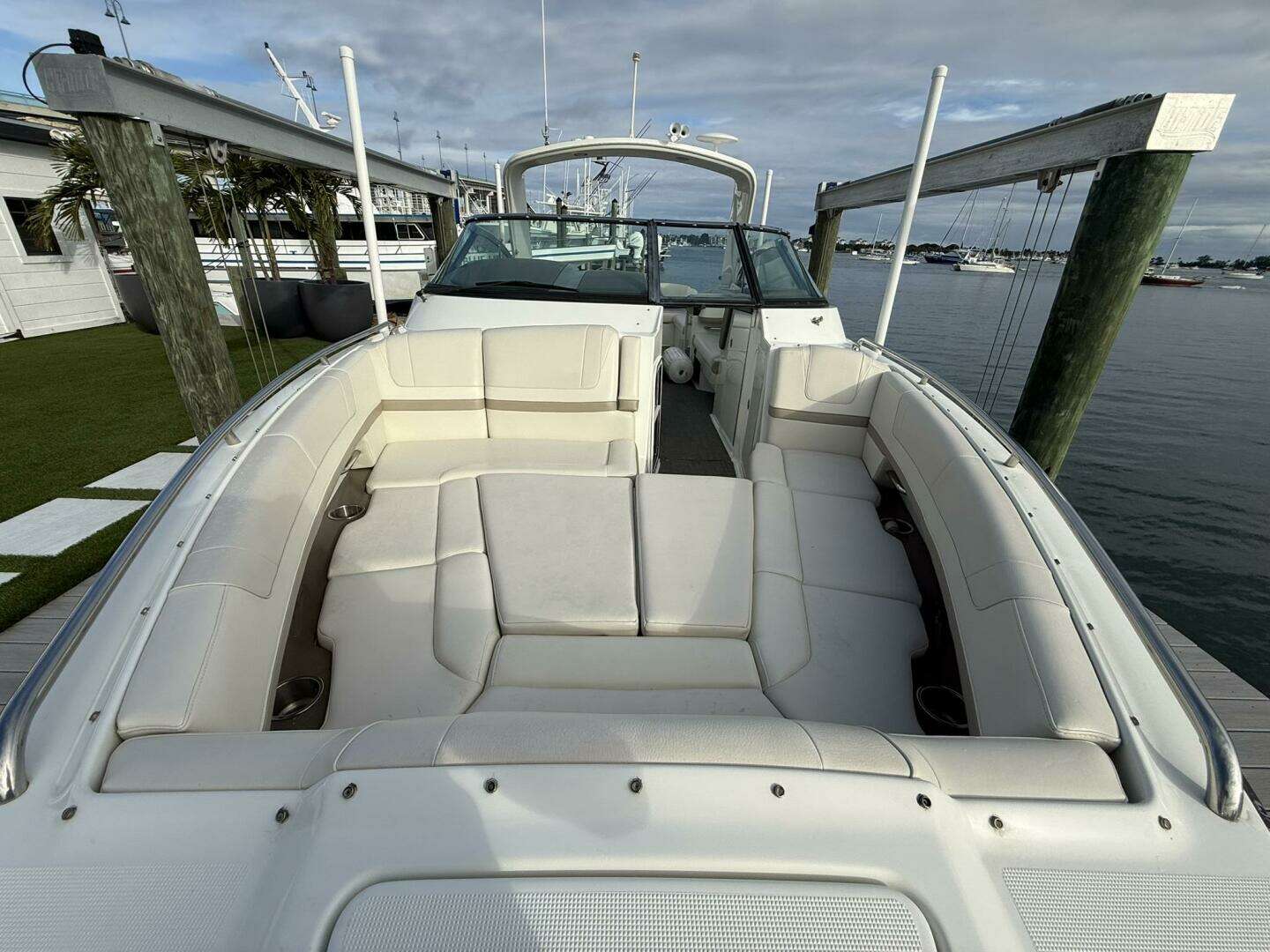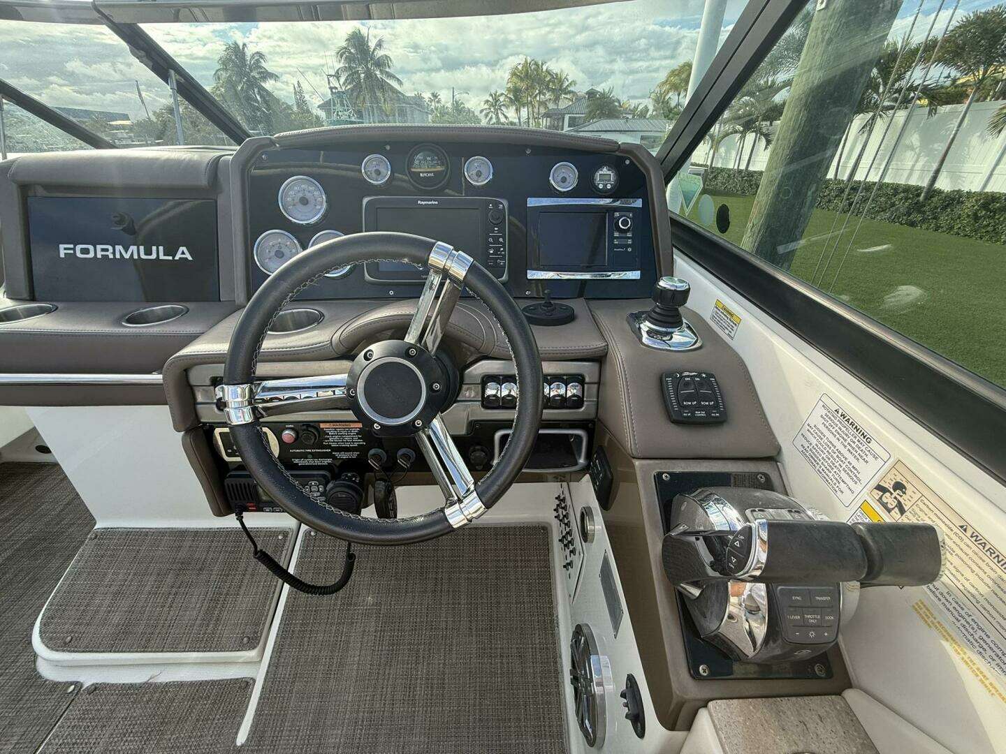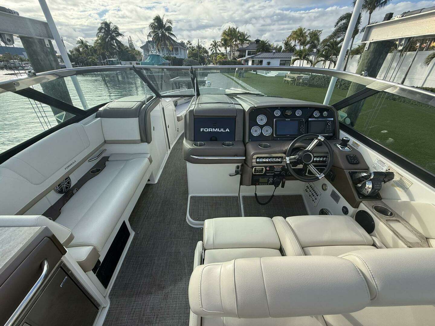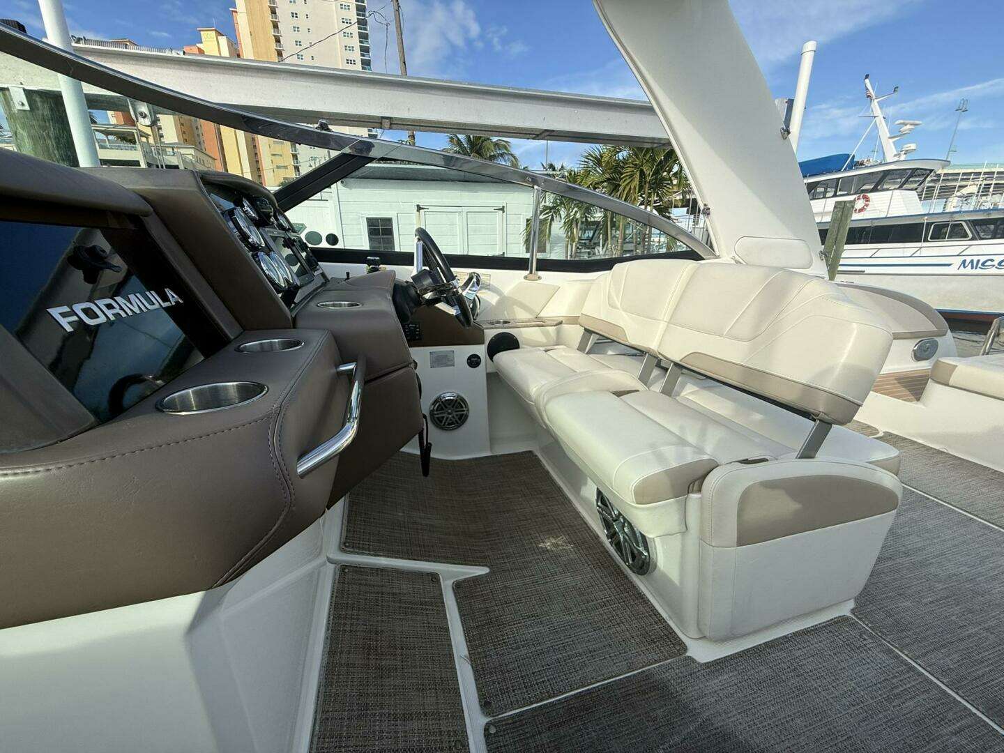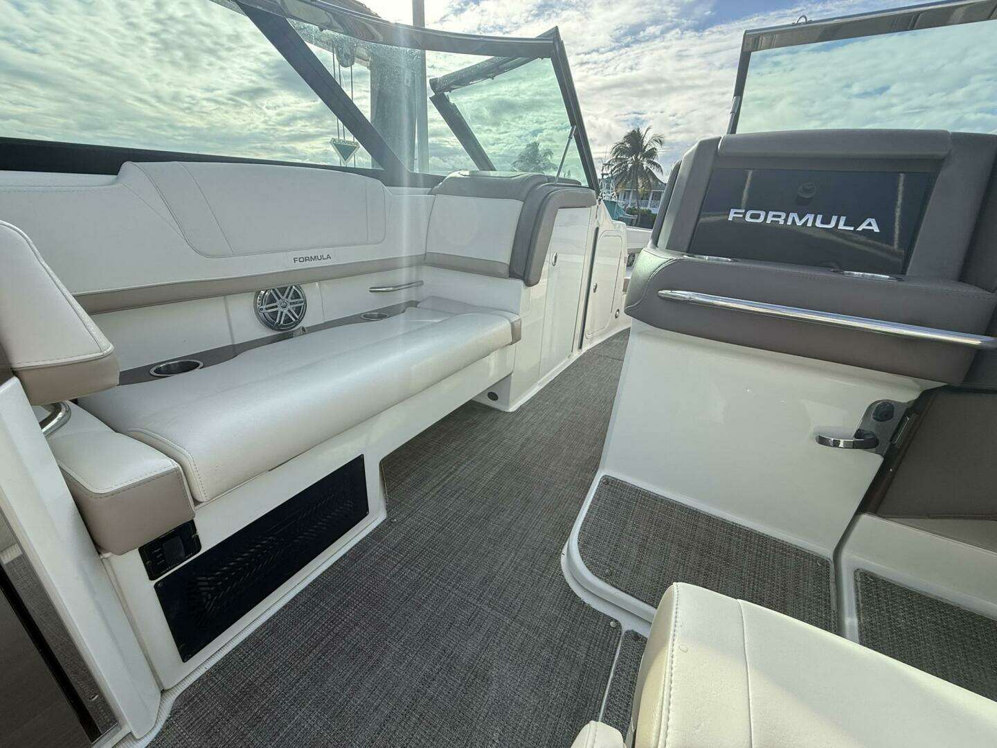 Equipped with Raymarine electronics and a premium JL Audio sound system. Spacious cockpit and bow seating make it great for cruising and entertaining.