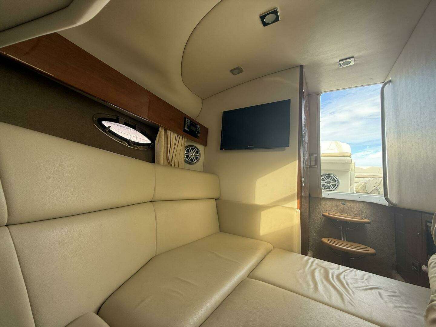 Below deck features a small cabin with berth, enclosed head, microwave, and TV, ideal for overnight stays or extended days on the water.