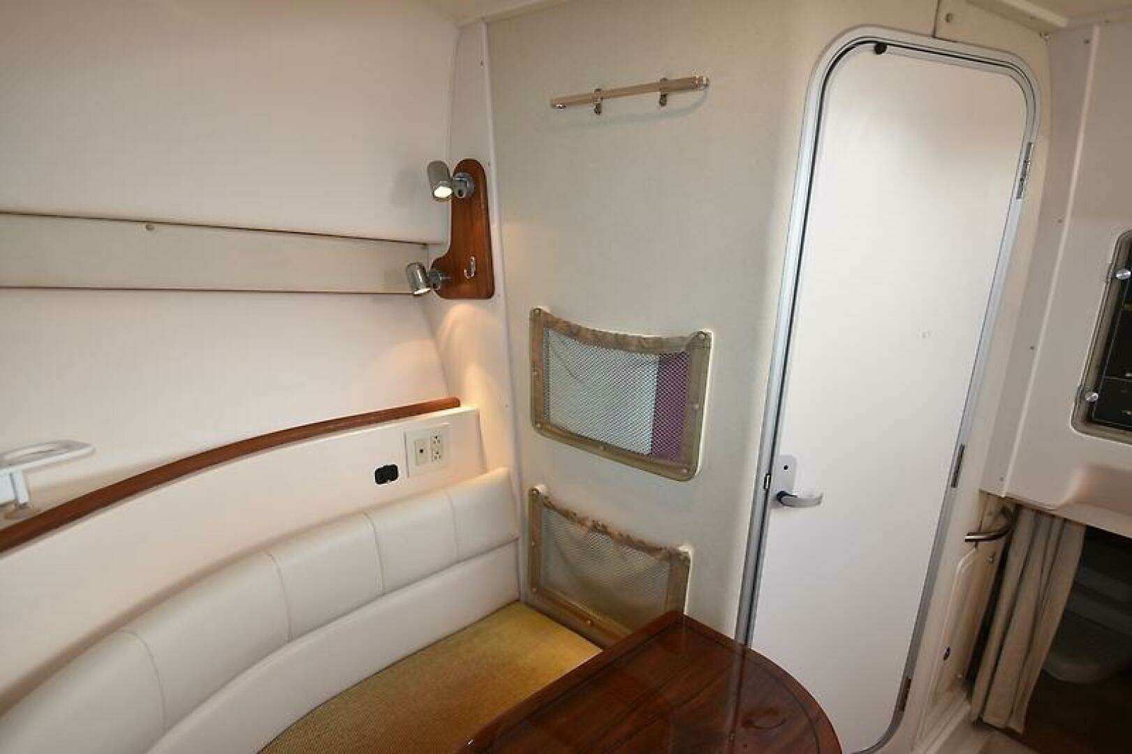 - Stbd side dinette table with Hi-Gloss teak table, reading lamps, book storage, Storage beneath the dinette seat