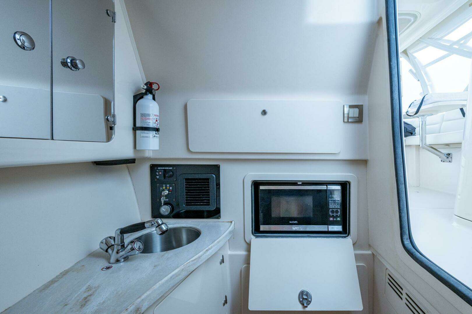 - Wet bar w/refrigerator, sink, storage drawers, trash bin, drink holders (2) & fire extinguisher holder (integrated with electronically operated helm seat)