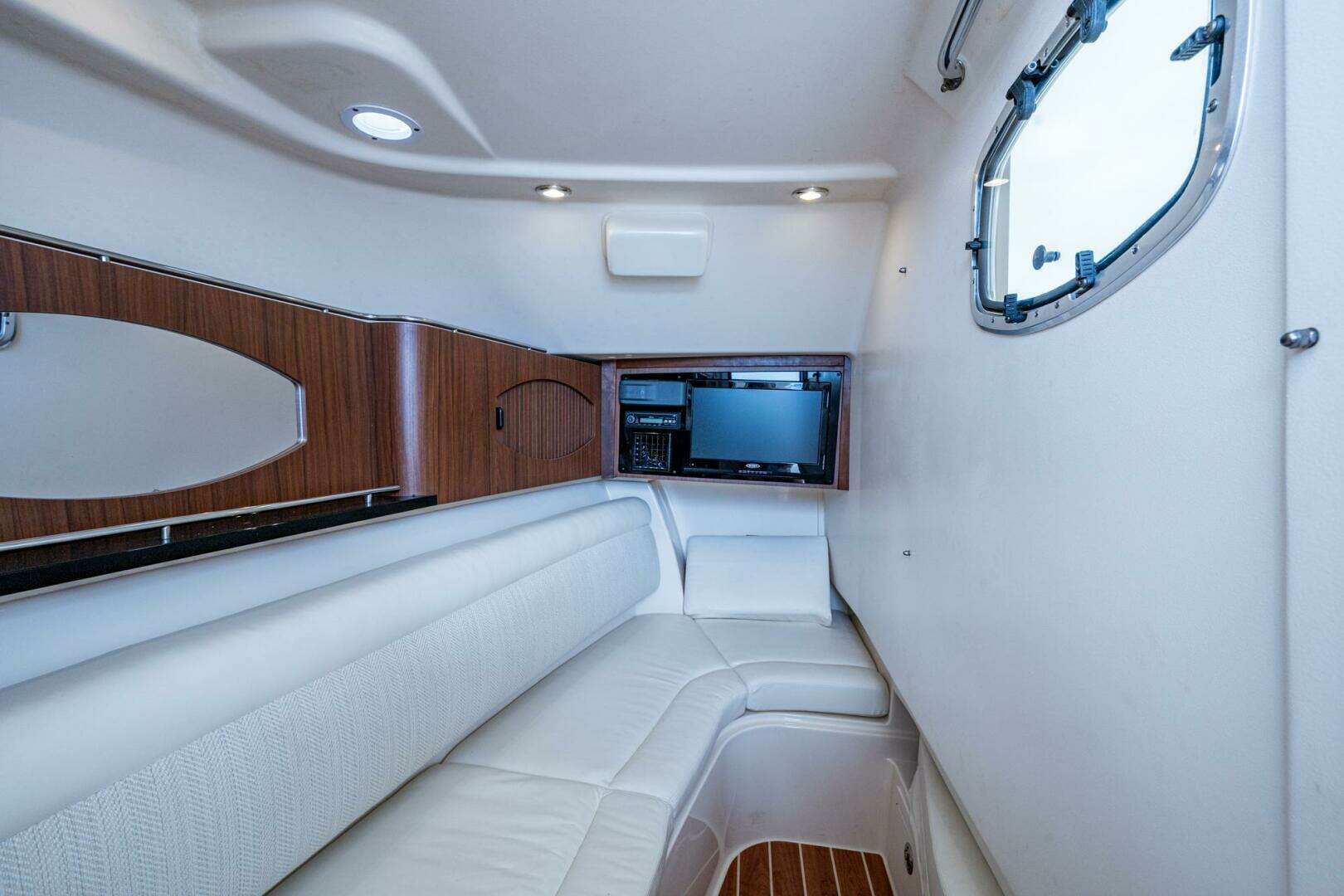 - Portside cabin console w/electronically operated sliding berth, bench seat, closet, drawers, mirror, lighting, tinted screened window & bulk storage