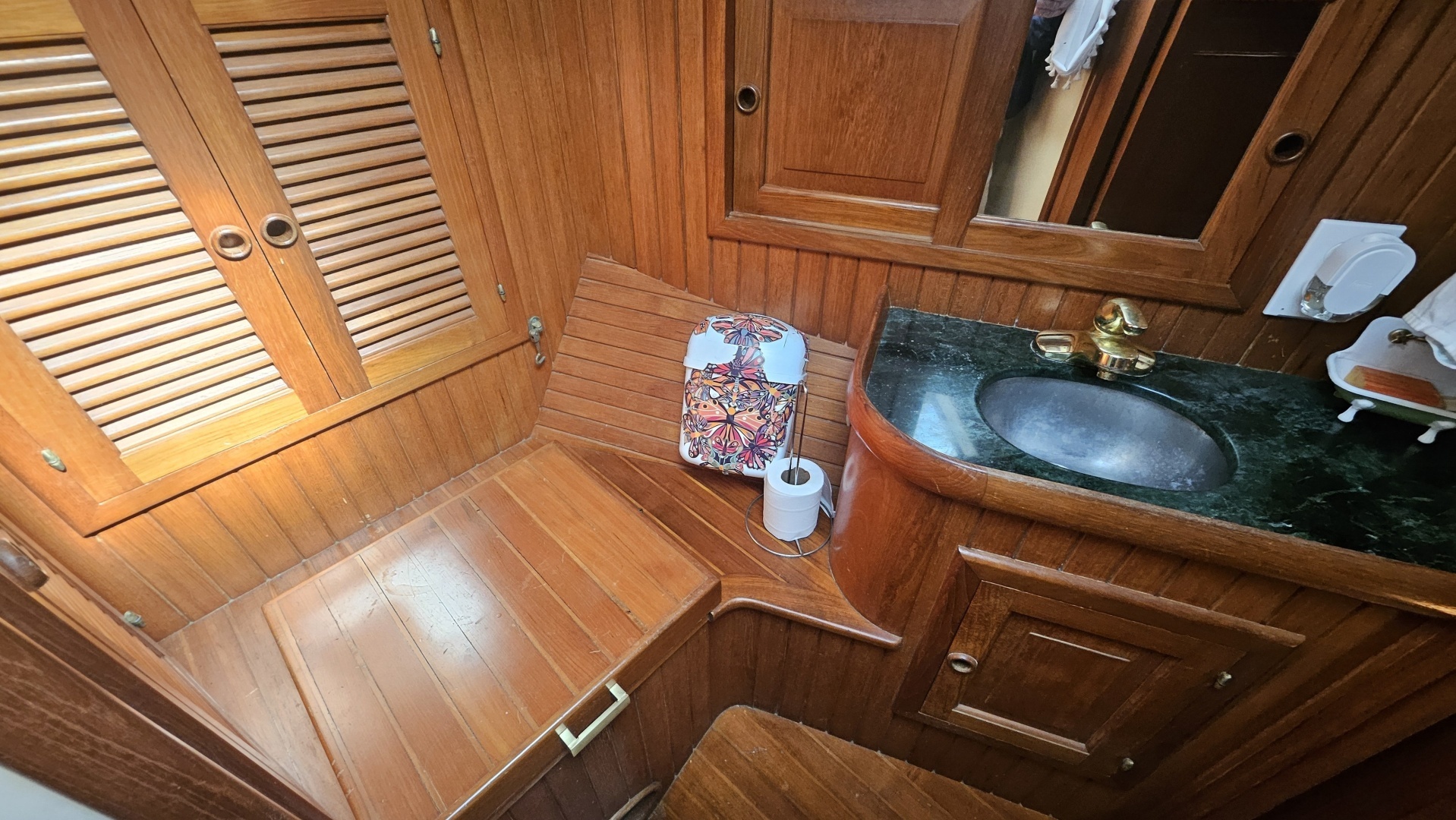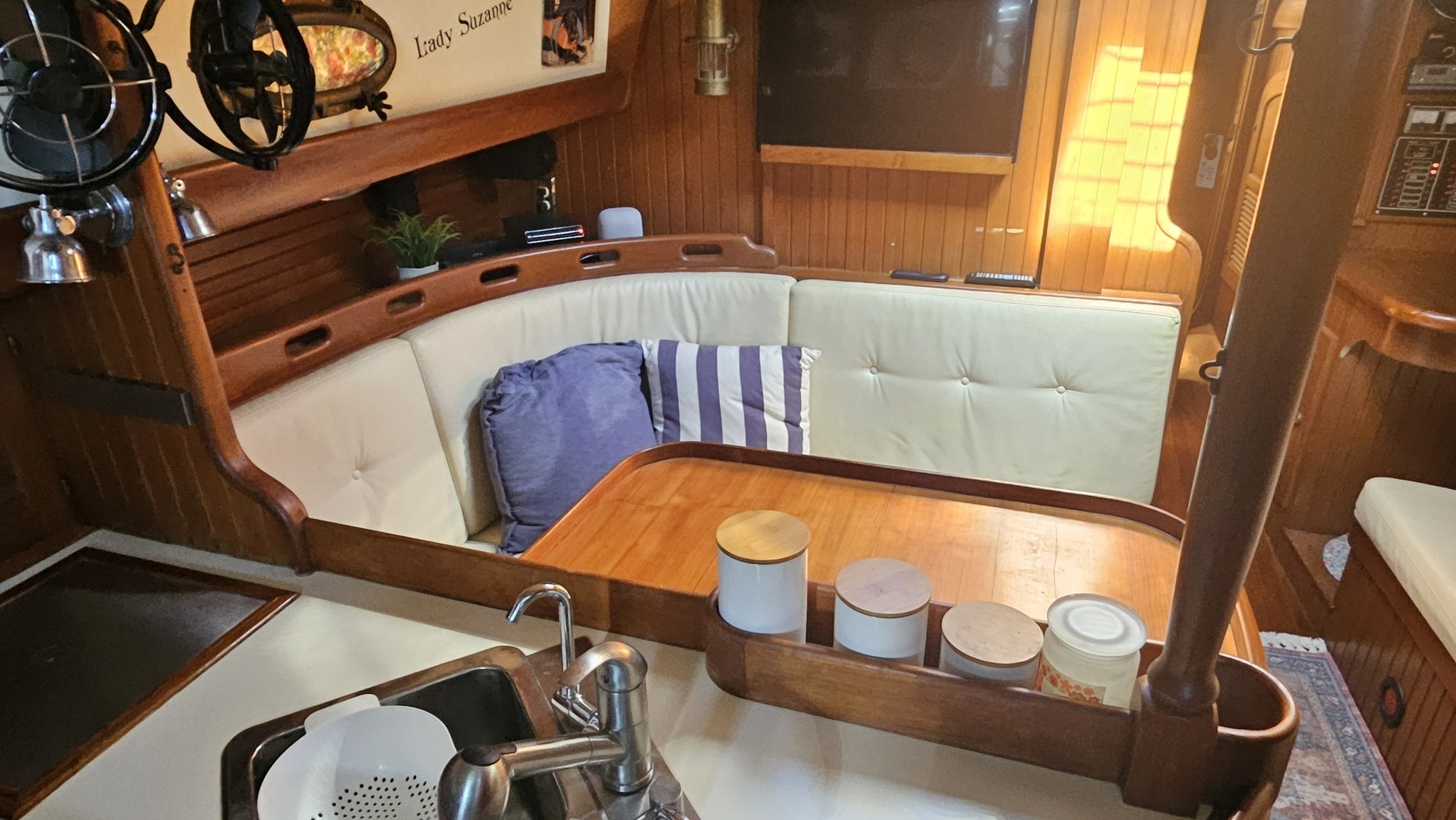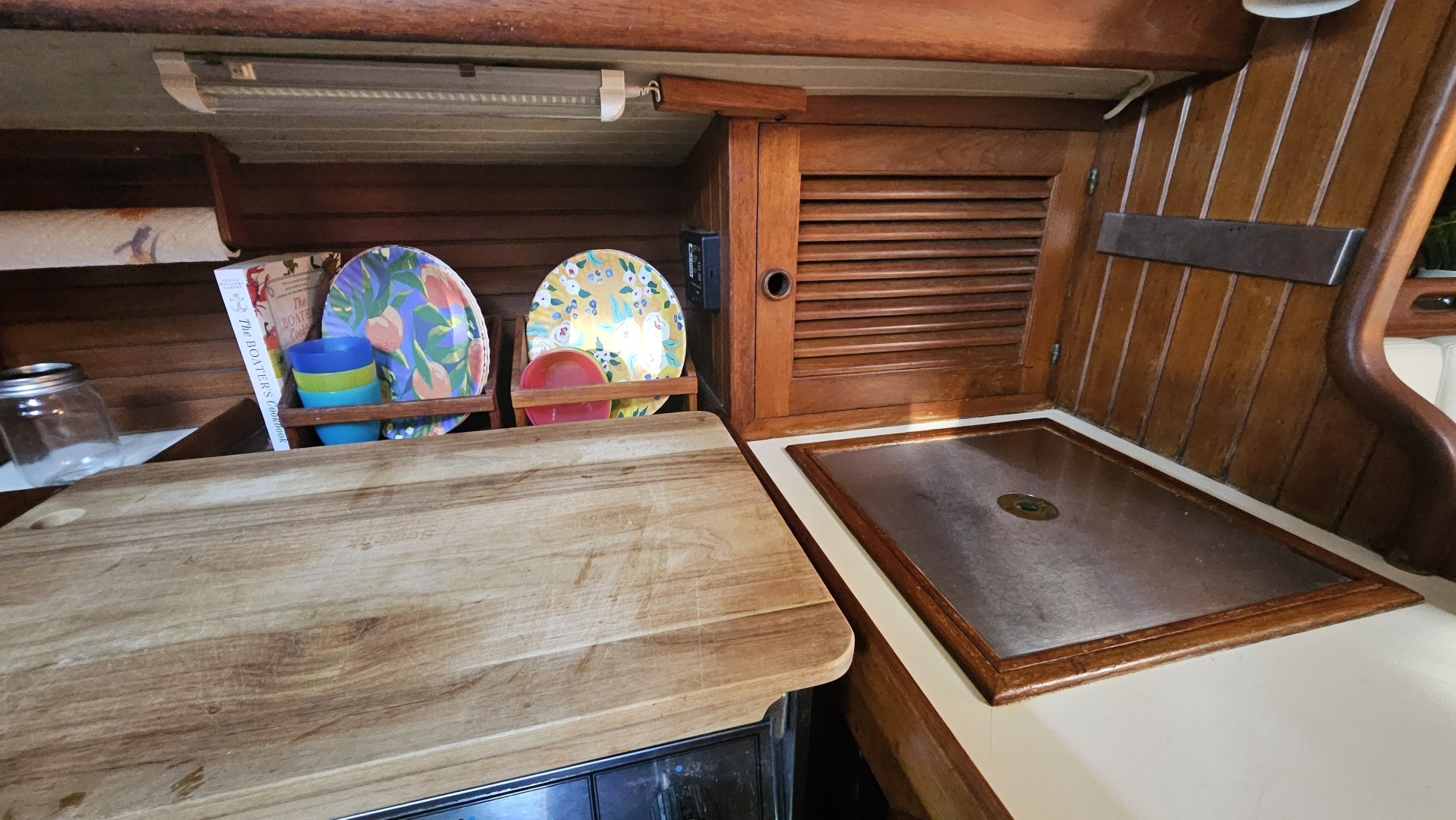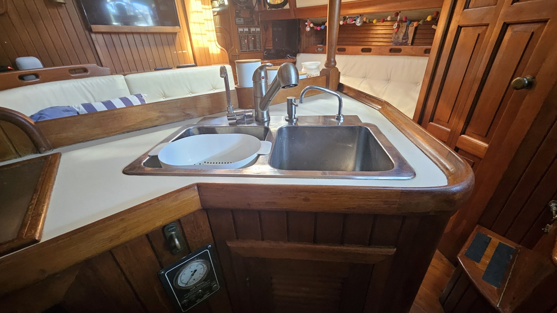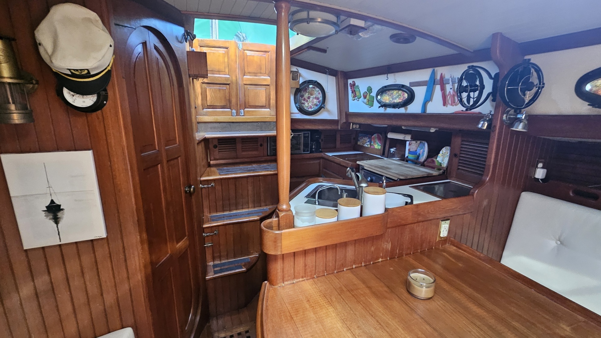 - Galley: Located to port at the companionway. It is large and functional, featuring a double stainless sink, gimballed propane stove with oven, and top/bottom loading icebox.