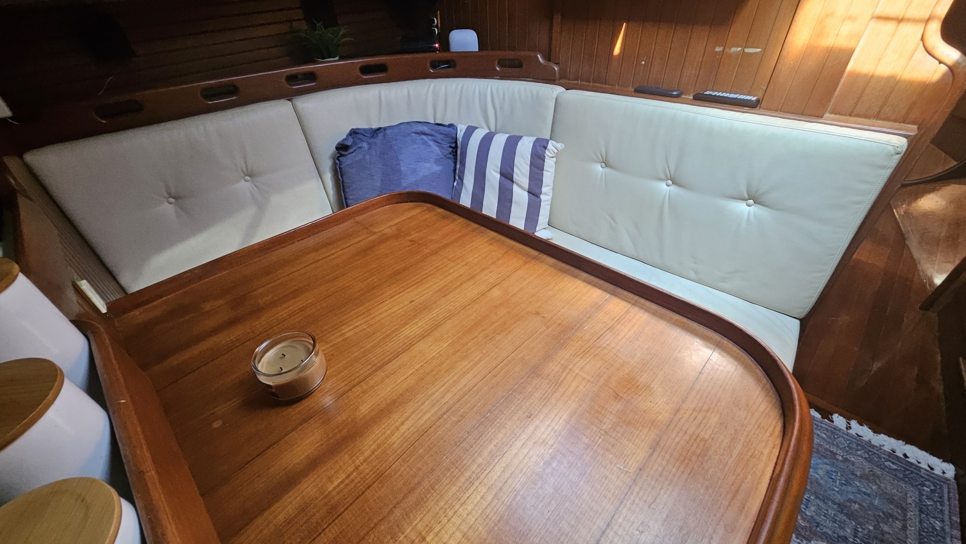 - Salon: Features a large U-shaped dining area to port (often with a table that seats six) and a settee/salon berth to starboard.