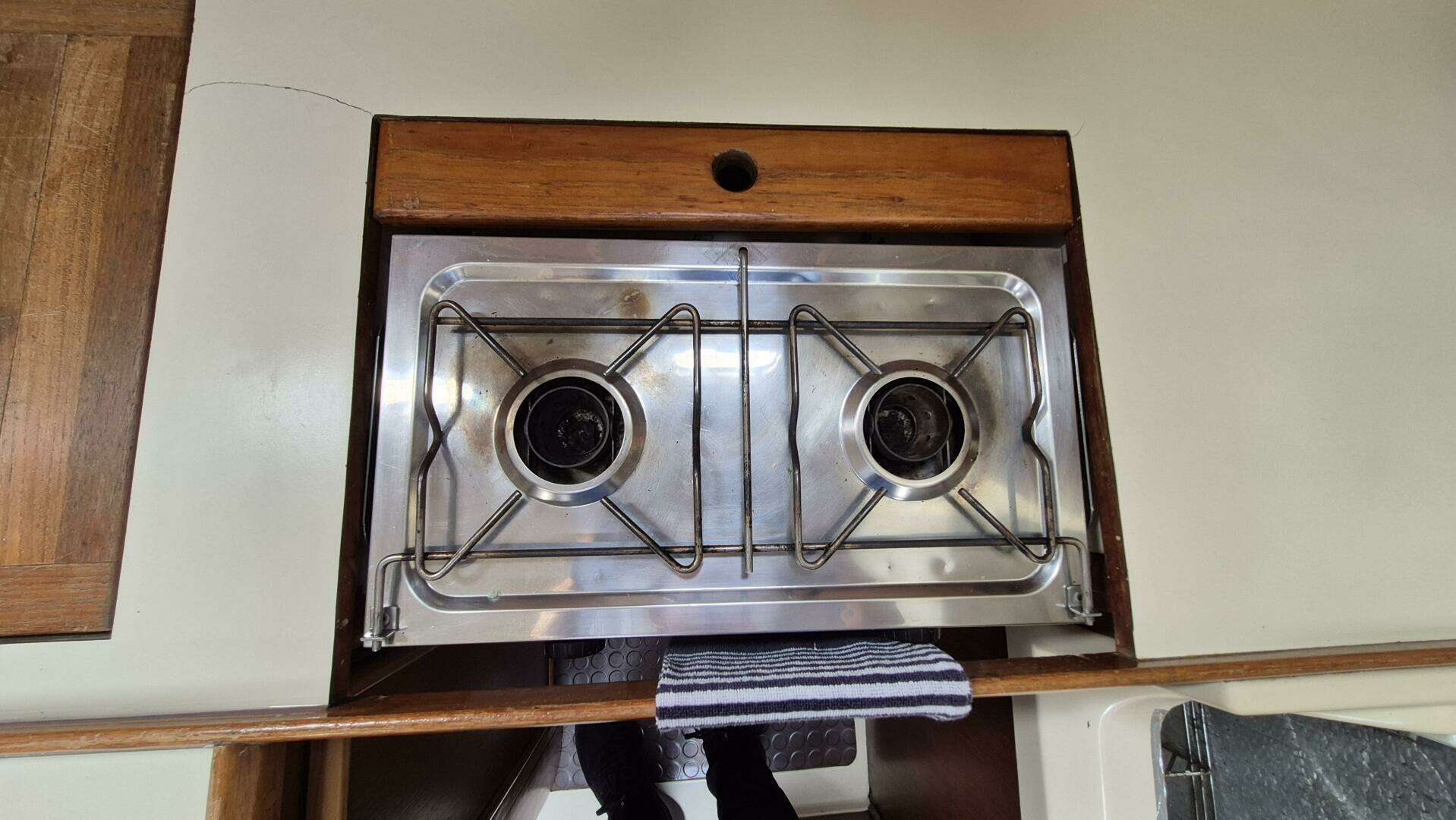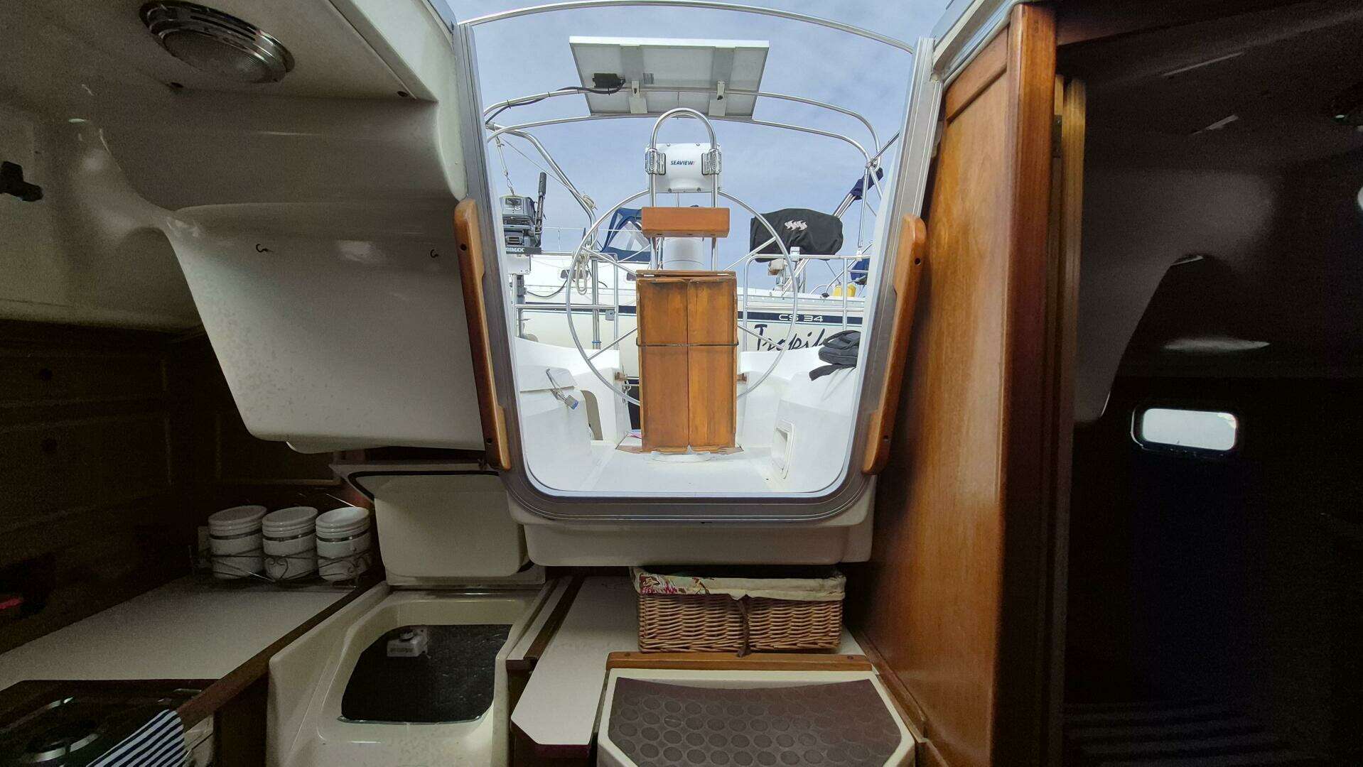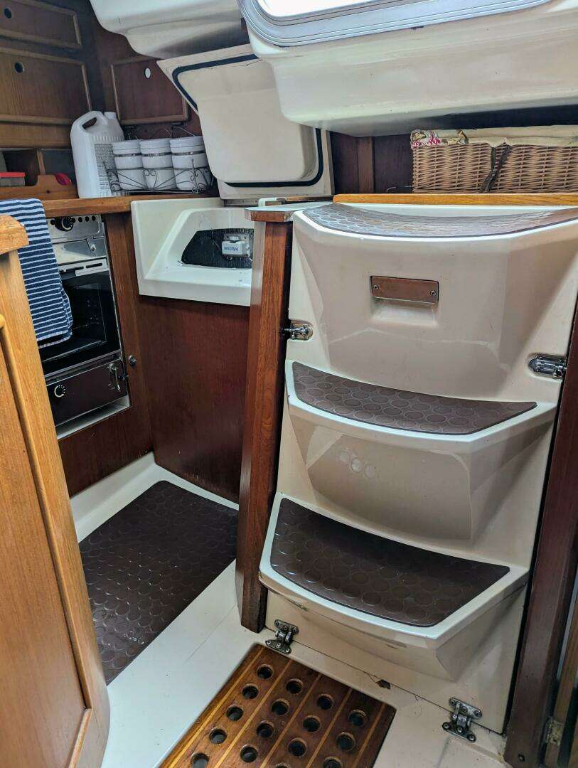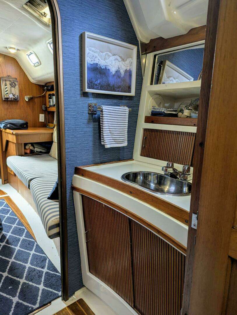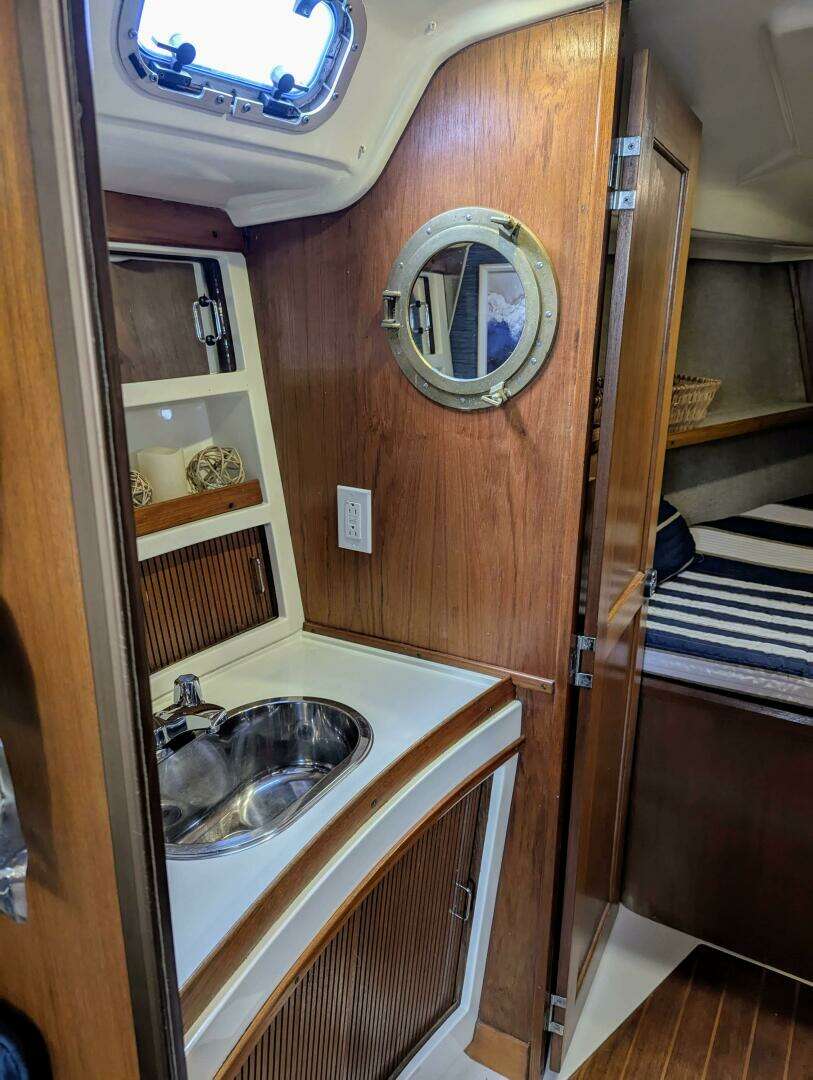 Below deck, this 33.5-footer impresses with light, ventilation, and space rarely found in boats this size. The aft stateroom features a walk-in layout with a full double berth and opening ports. Forward, the private V-berth is spacious and well-ventilated. A U-shaped dinette converts into an additional double berth, and a long settee to port adds a fifth bunk if needed. The galley is fully equipped with a 2-burner alcohol stove/oven, deep stainless sinks, pressurized water, and 12V refrigeration, while the adjacent nav station and full-size head complete the cruiser’s interior layout.