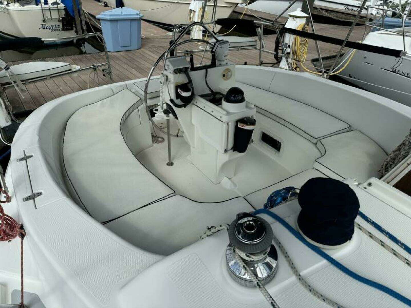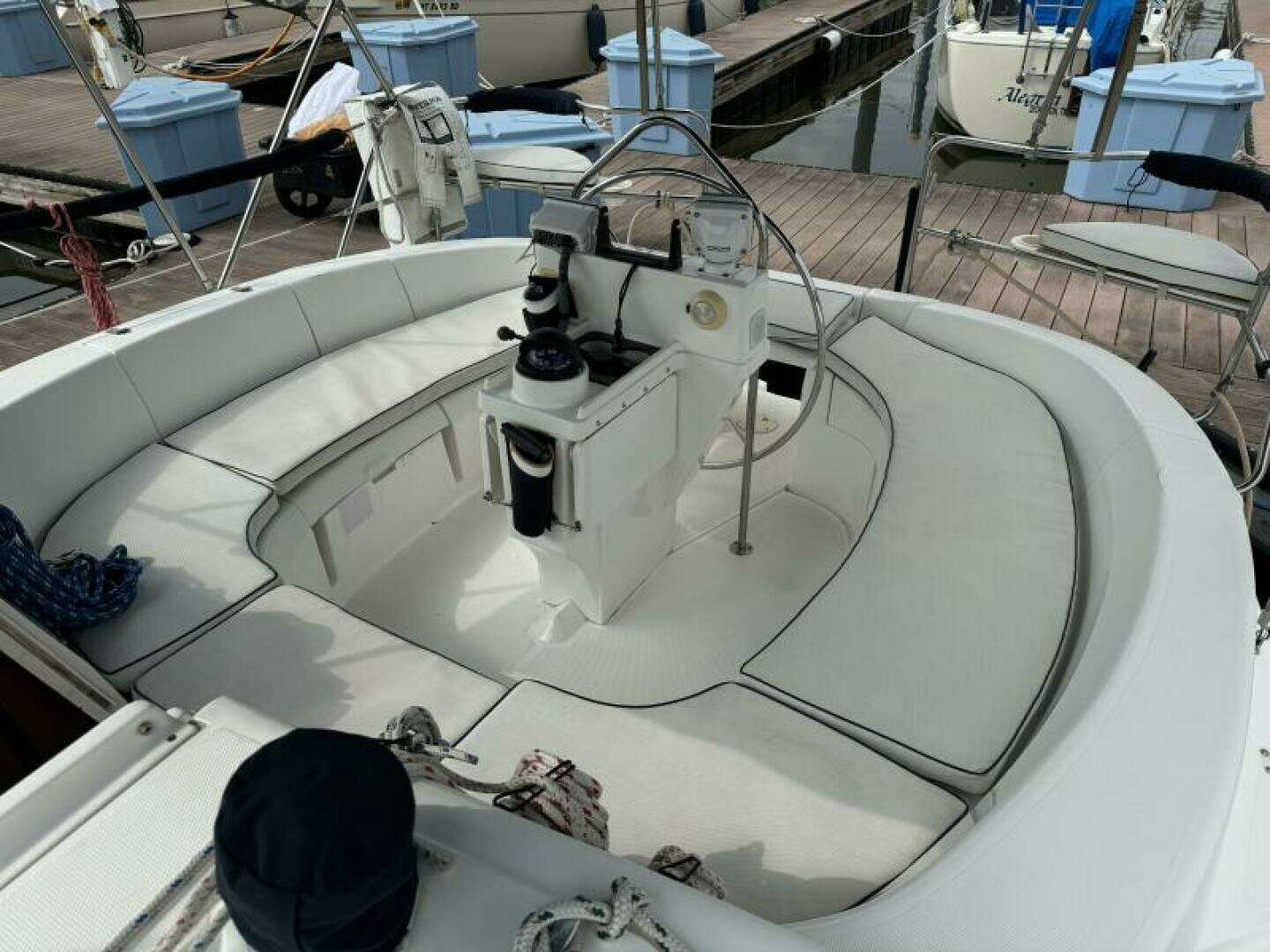 - Head(s): at base of companionway to starboard, large head compartment with shower, storage and a wet locker.