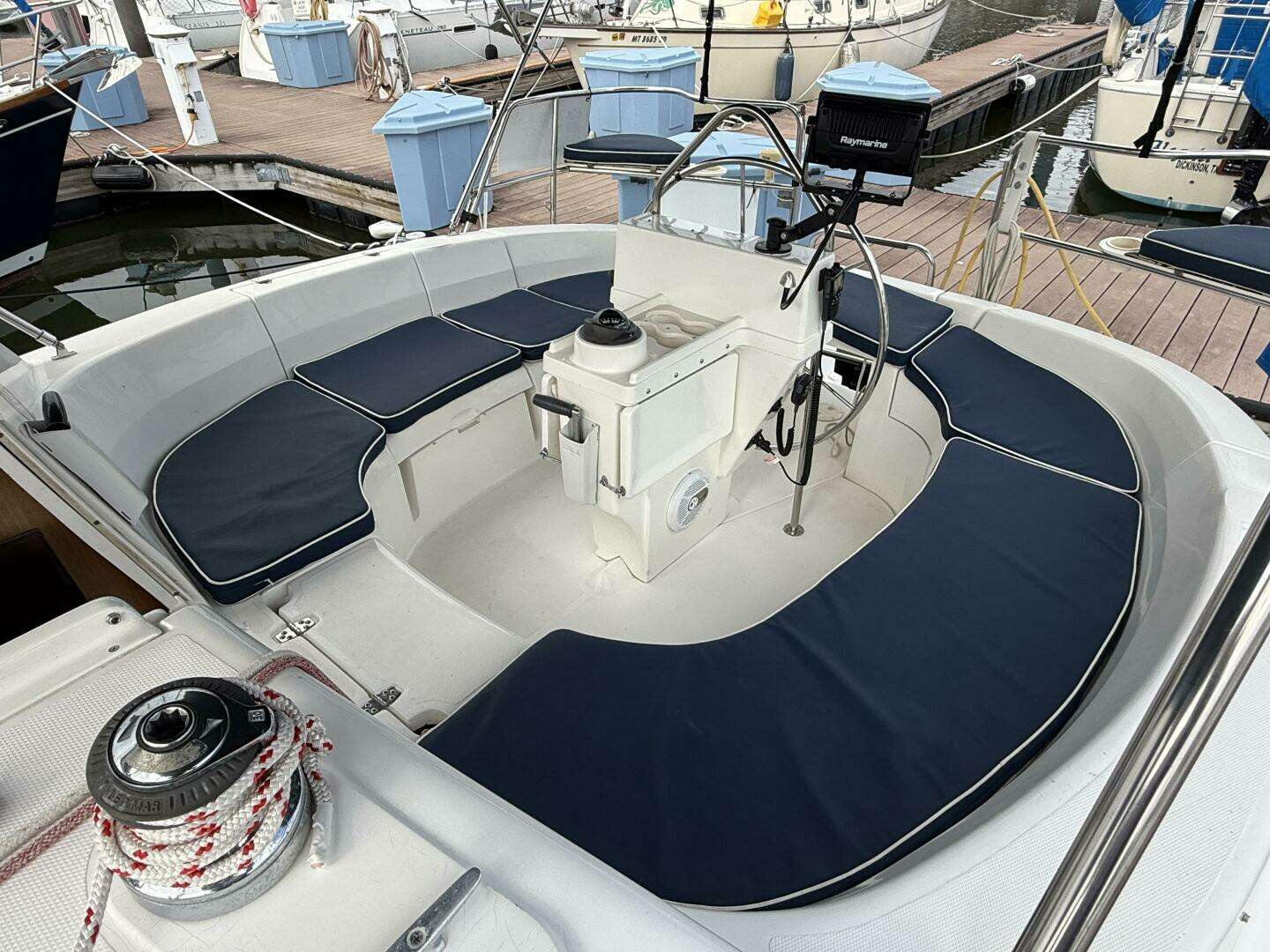 Down below, the interior is surprisingly generous for a boat of her size. Large windows flood the salon with natural light, the U-shaped dinette is perfect for gathering, and the galley is fully equipped to keep everyone comfortable on extended cruises. With a roomy aft stateroom, forward V-berth, and private head, she sleeps up to six in comfort.