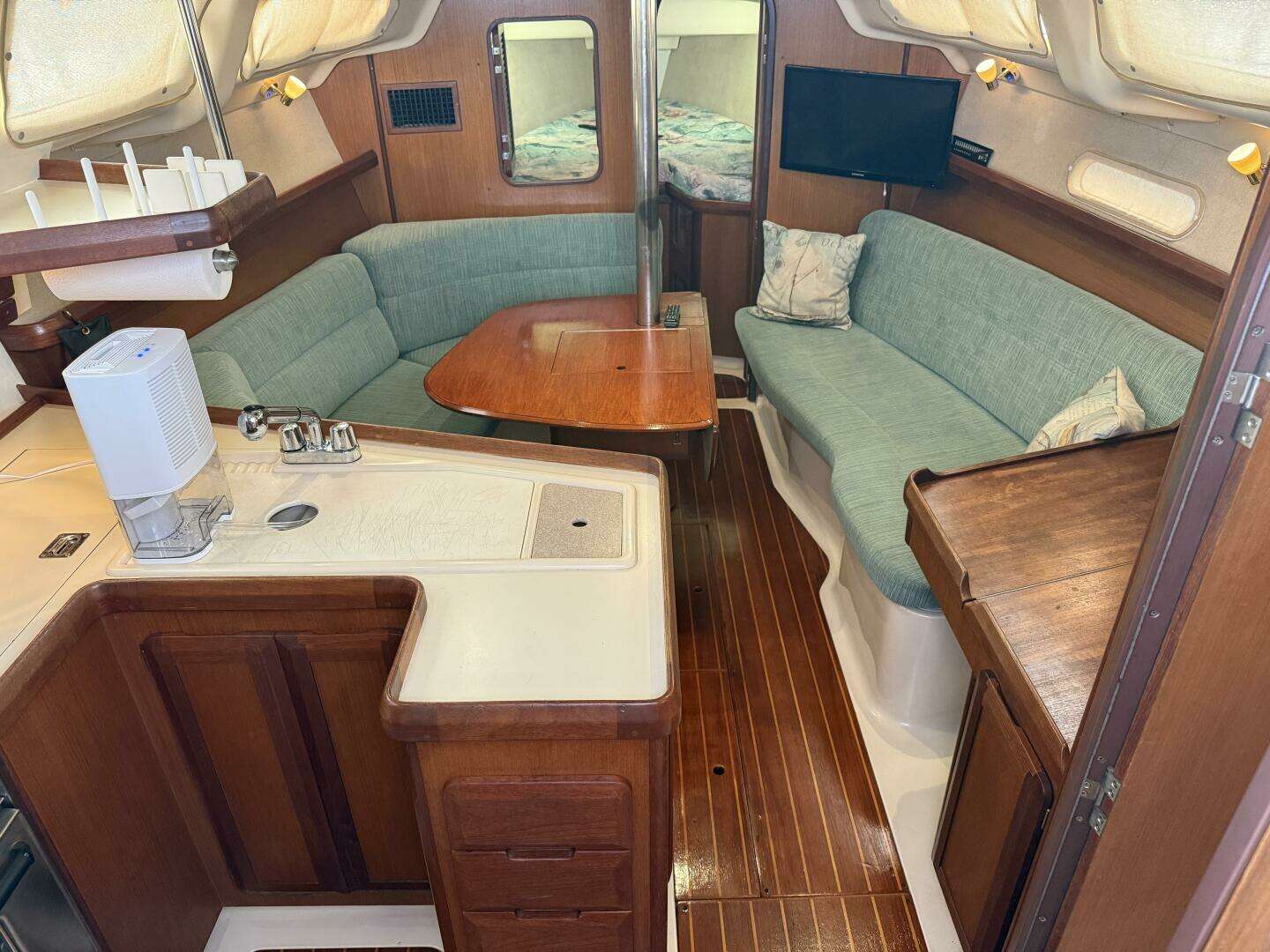- Salon with a u-shaped dinette to port & one drop leaf on the table, straight settee to starboard. Opening and fixed hatches and portlights allow in lots of natural light as well as fresh air.
