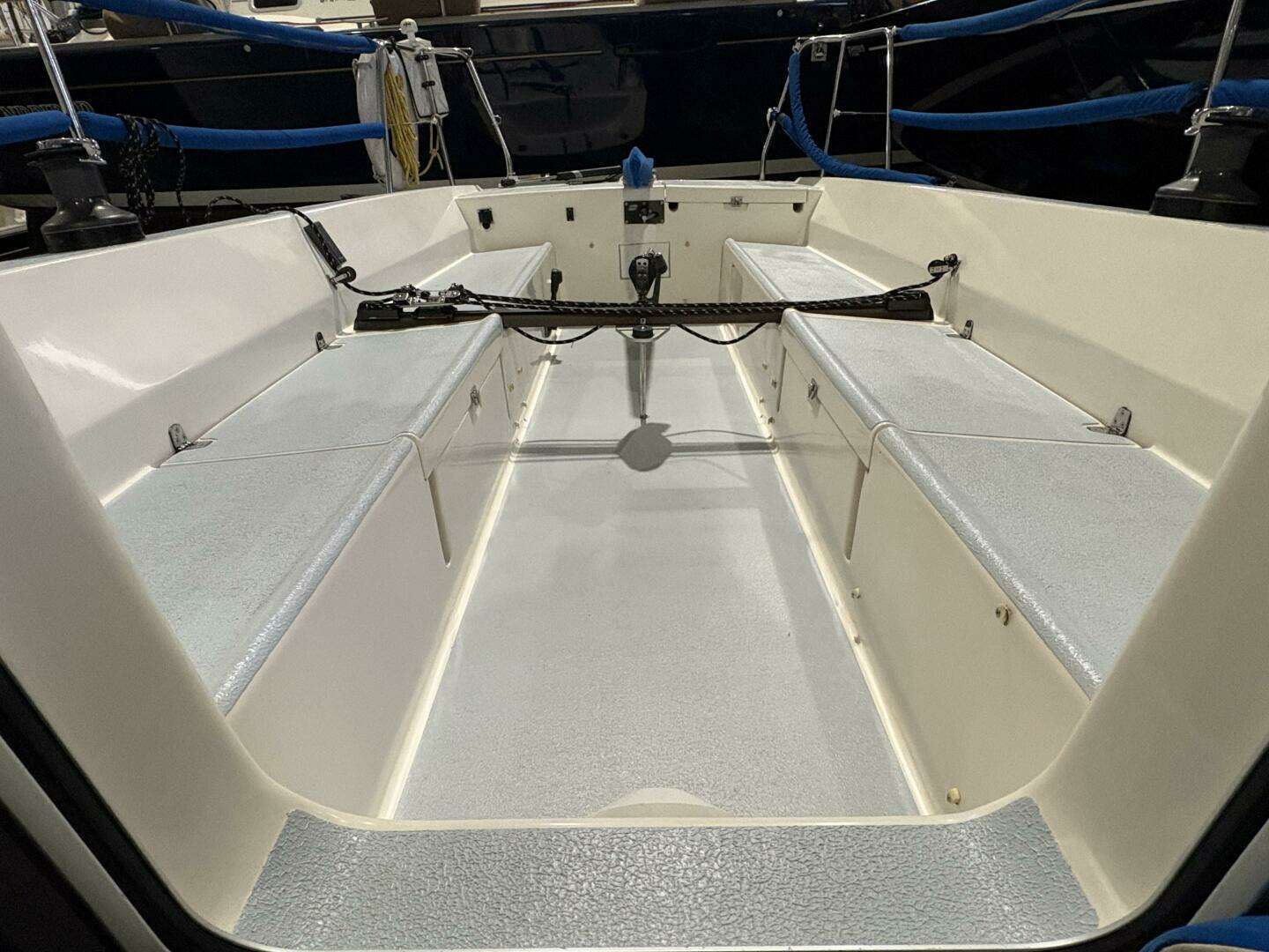• Harken mainsheet traveler track recessed in cockpit seat with 4:1 Harken “windward-sheeting” traveler control system.