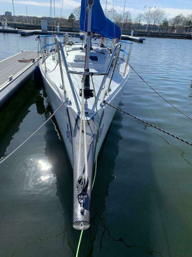 • Hall tapered carbon fiber mast, autoclave cured with double airfoil aluminum spreaders, main, jib, spin halyard and topping lift sheaves, spin/whisker pole track with sliding eye on front of mast, Harken System “A” mainsail luff track; mast finished in Awlgrip off-white.
