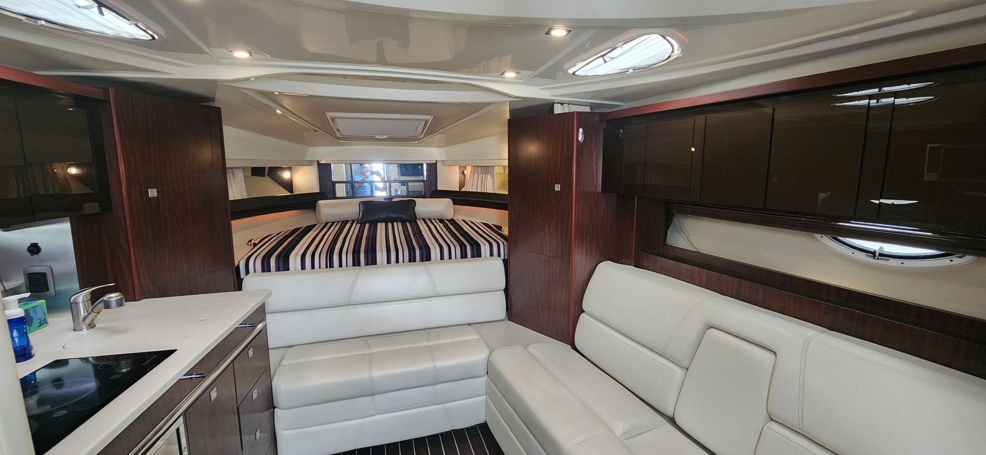 The 355 has a factory fiberglass hardtop with a 4-sided enclosure which makes for great protection. Her cockpit offers plenty of seating and a aft facing lounge that flips fore and aft.