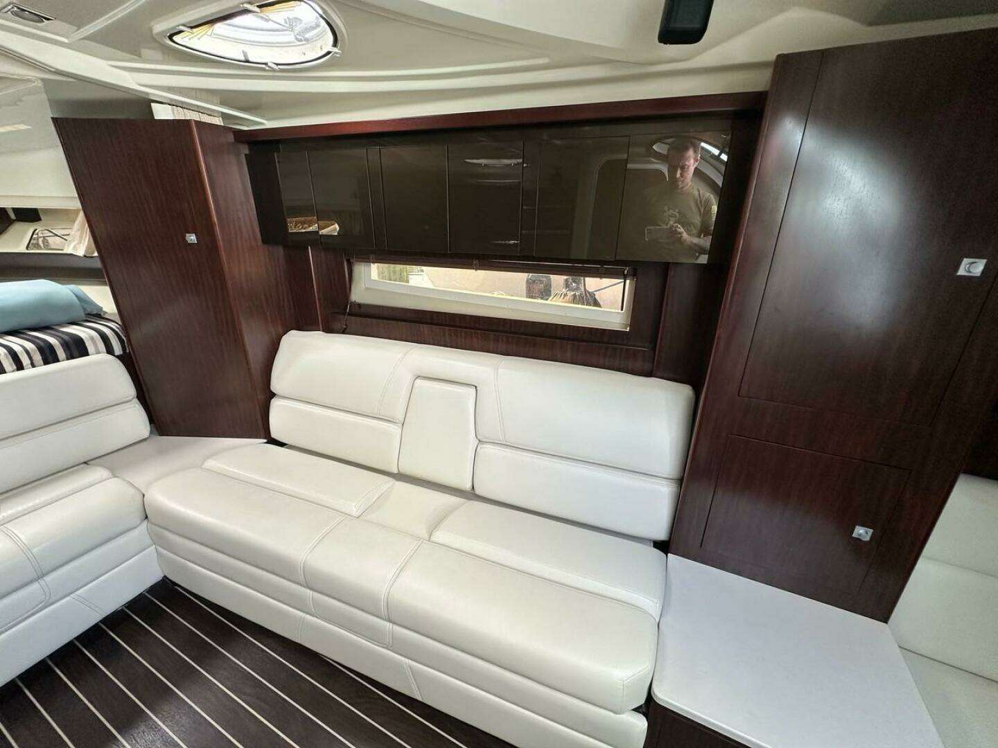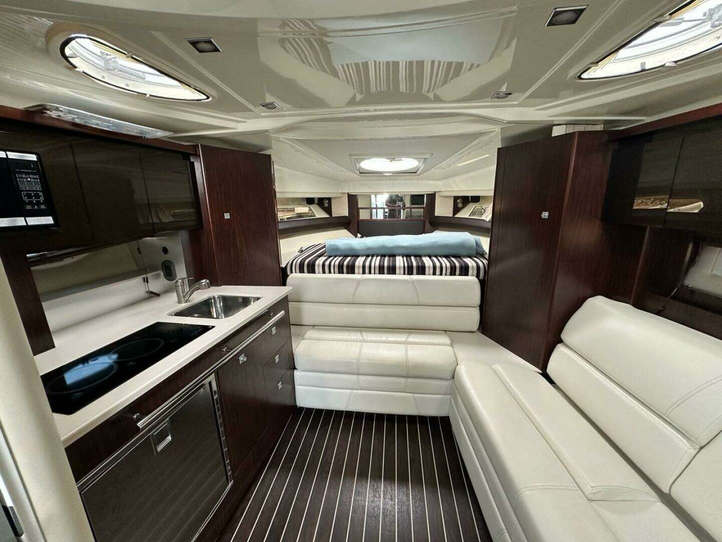 - Full Galley & Wet Bar: Includes a microwave, dual-burner electric stove, refrigerator, sink, and a cockpit wet bar with an ice bucket for easy entertaining.