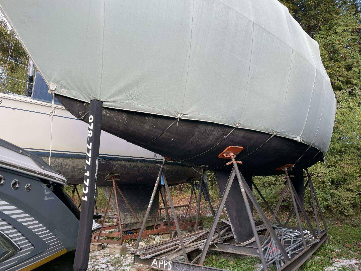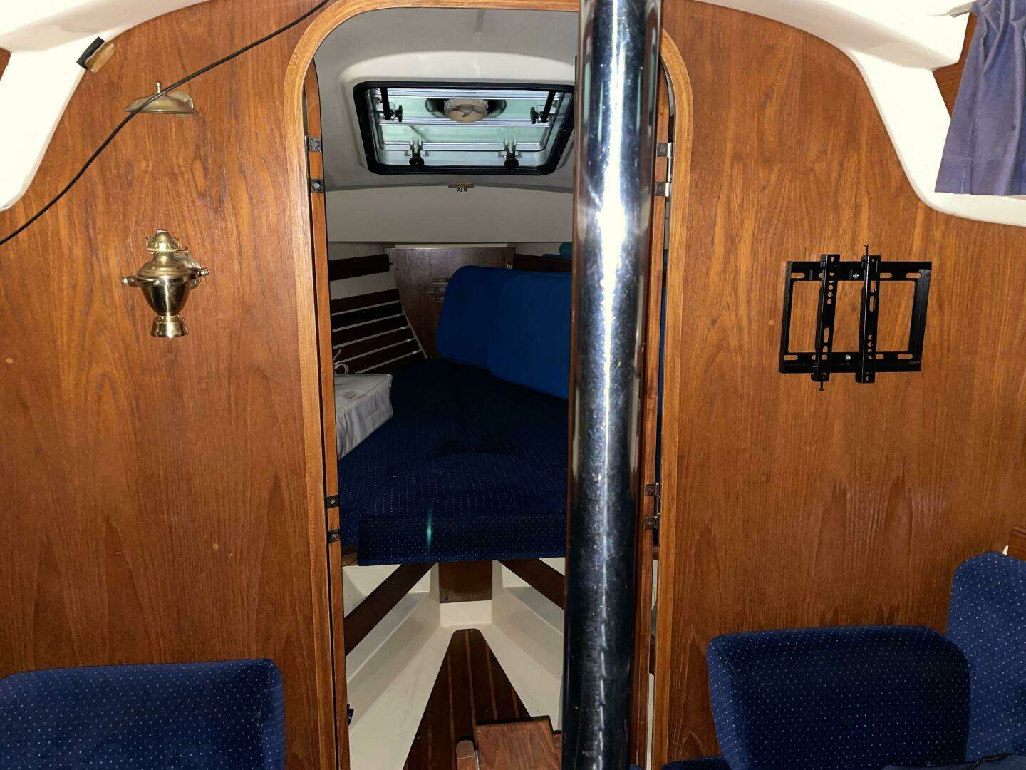 Fore to aft: V berth with 4" mattresses, hatch overhead, shelves to port and starboard, hanging locker, bureau with bin storage and privacy door. L-shaped settee to starboard converts to a double berth, settee opposite, folding table on centerline. The galley is next aft, L shaped galley on starboard, icebox/chart table combination to port. Wet locker; full head with hatch, pressure water, shower with sump pump, molded vanity with sink, manual marine head with holding tank and deck pompout. Large private queen size berth aft with varnished teak and holly sole; curtains, interior handrails.