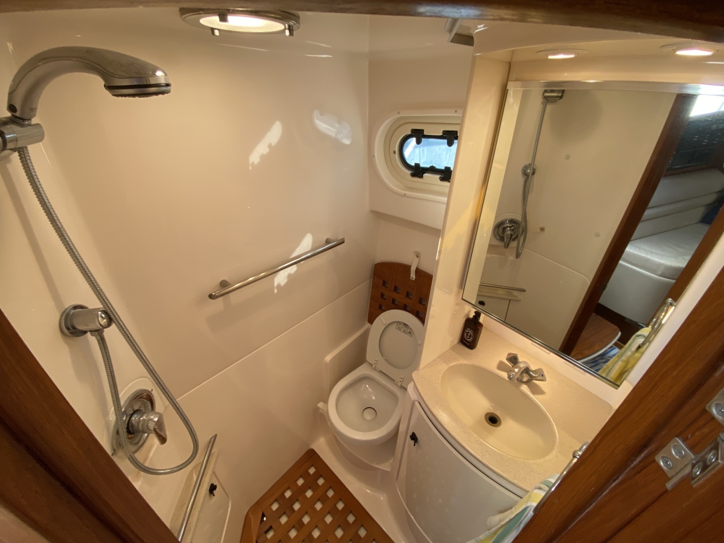 - Vacuflush head with separate teak grated shower with over 6.6 ft of head room and port hole
