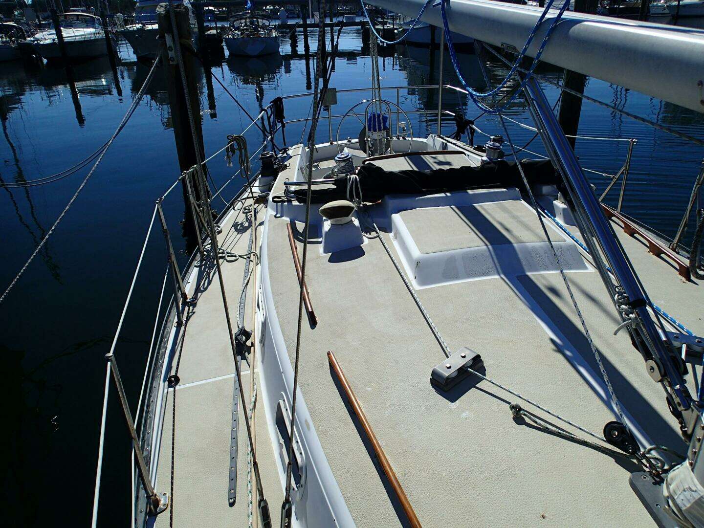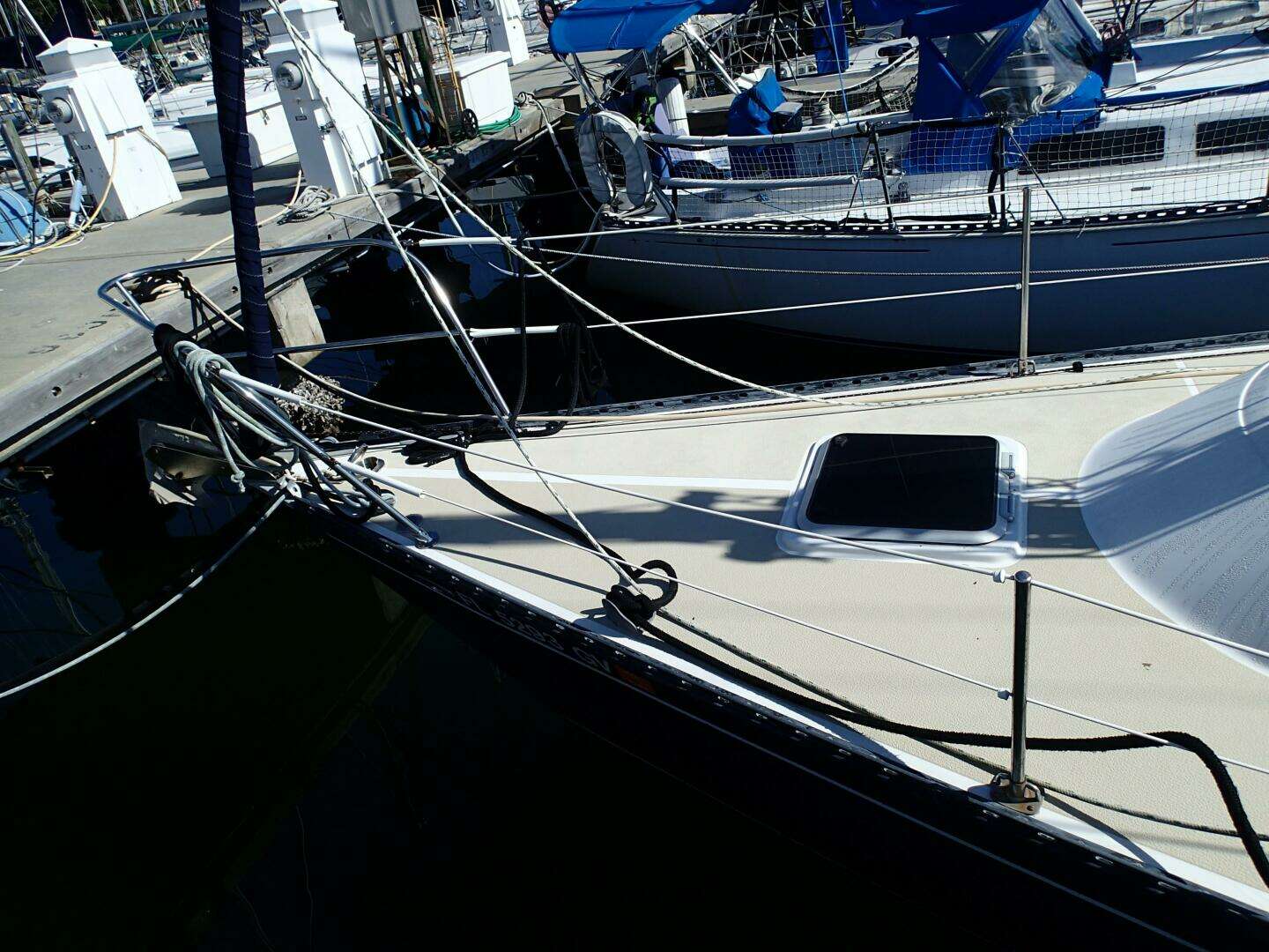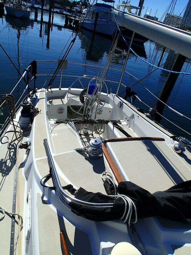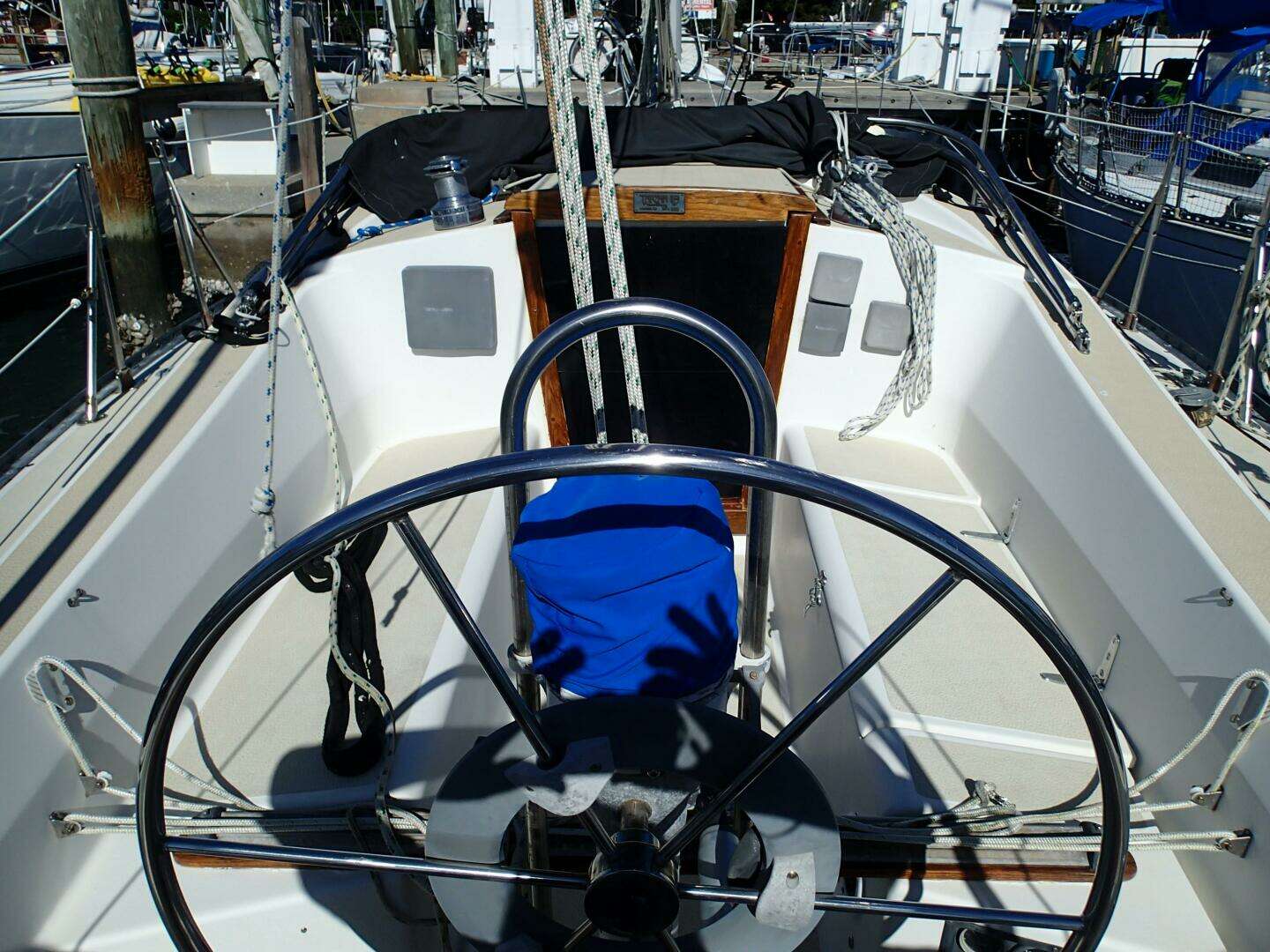 Wheel Steering, running rigging and lines led to the cockpit along with self tailing winch upgrades. Also electronics have been added and are modern. The traveler spans the cockpit just fore of the wheel, and it's well positioned for efficient sheeting. The fractionally rigged mast has double spreaders along with nice wide side decks with molded nonskid from the Tartan production.