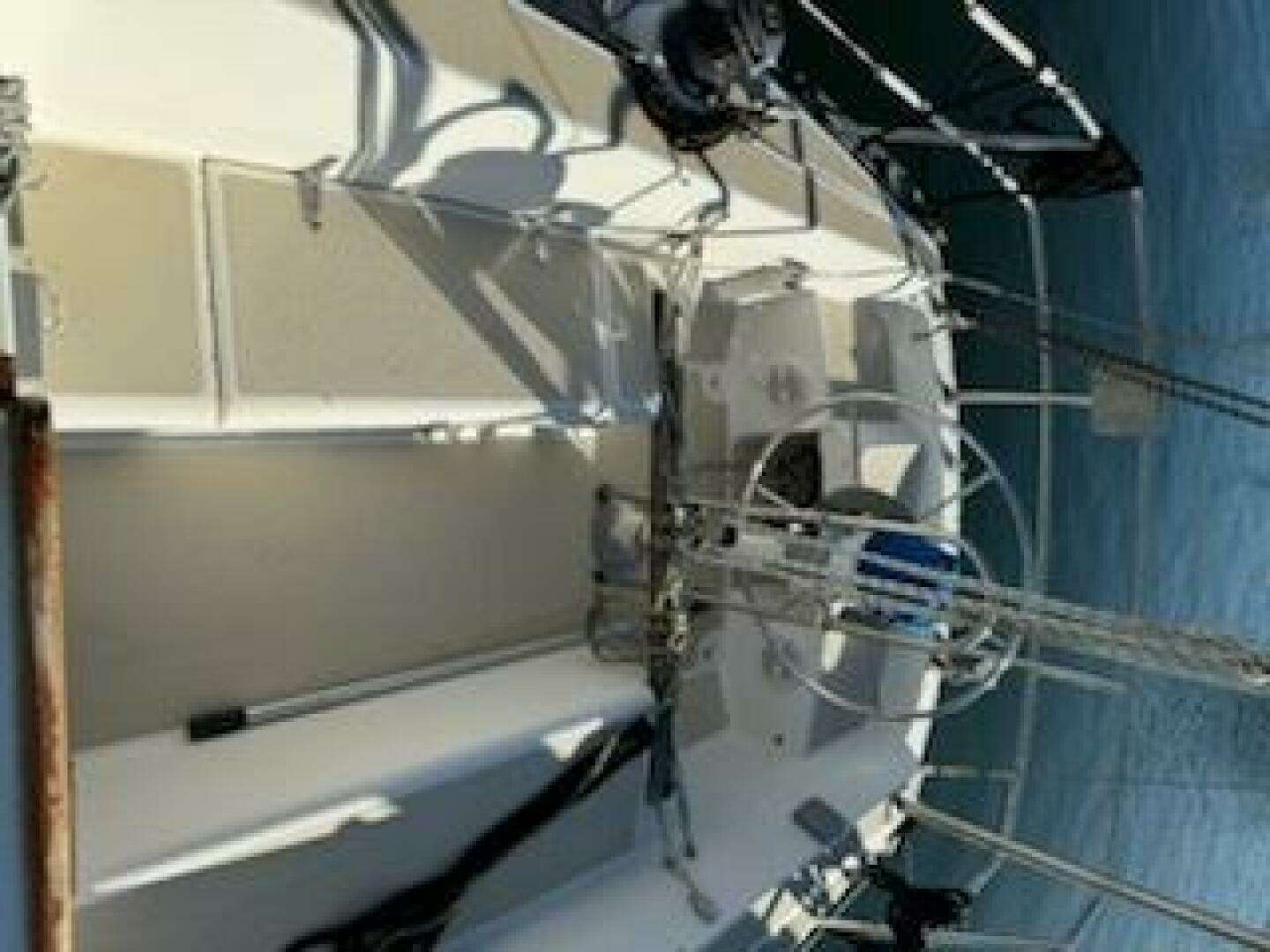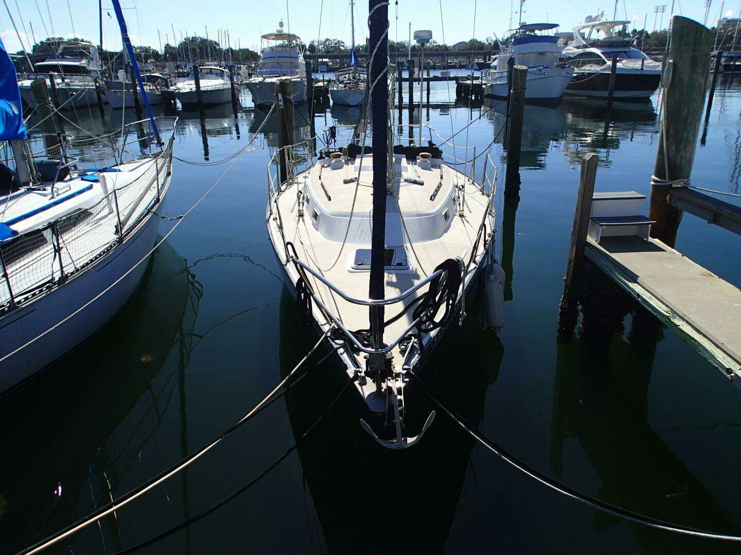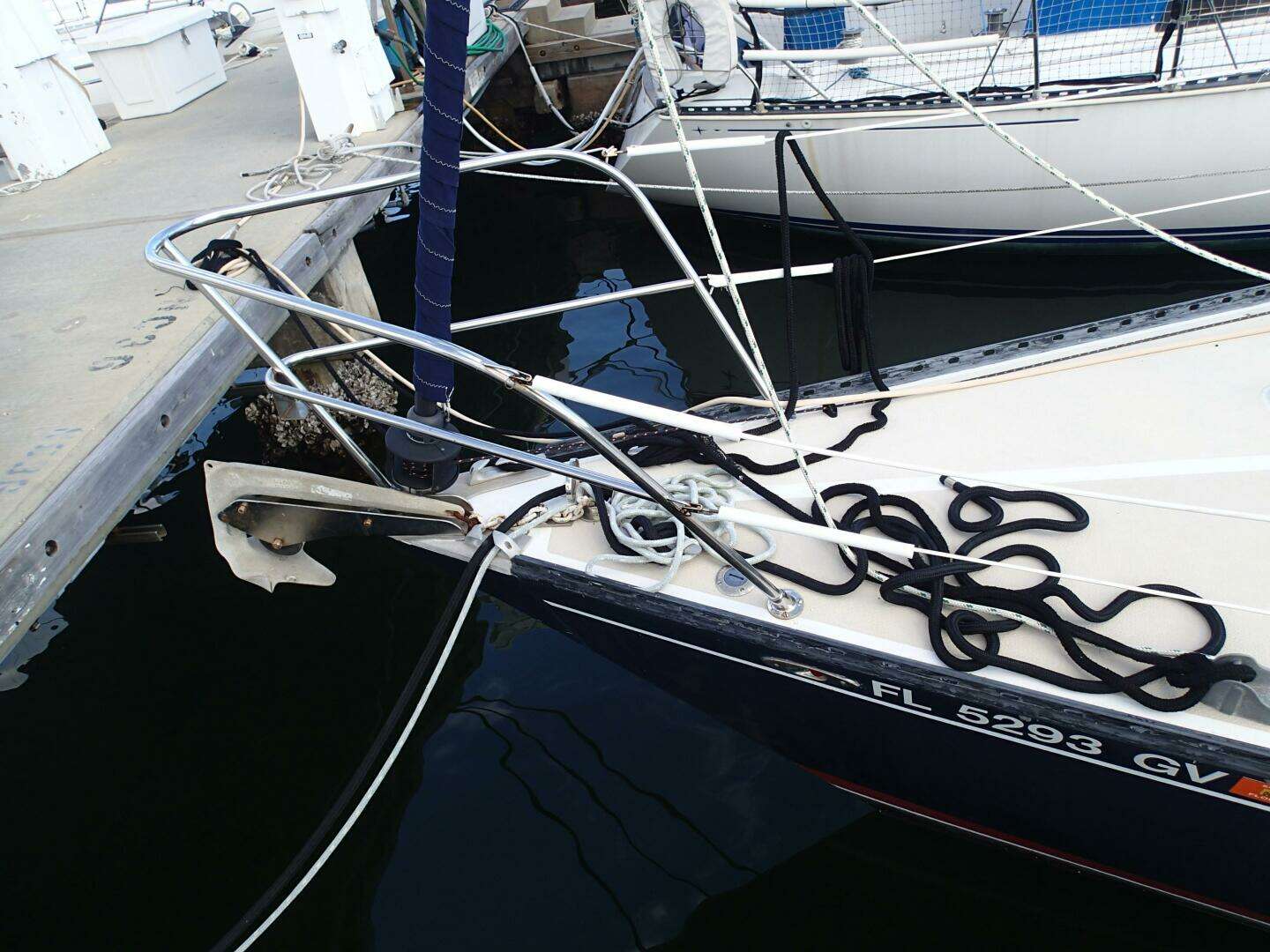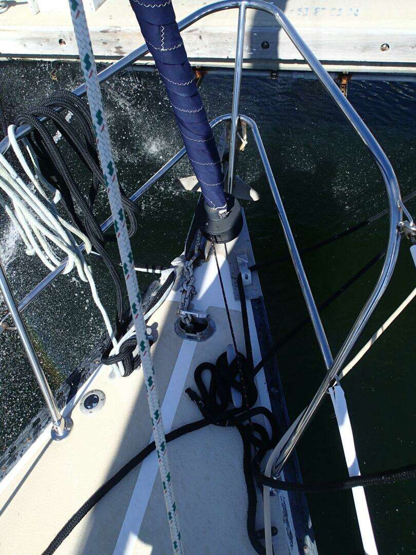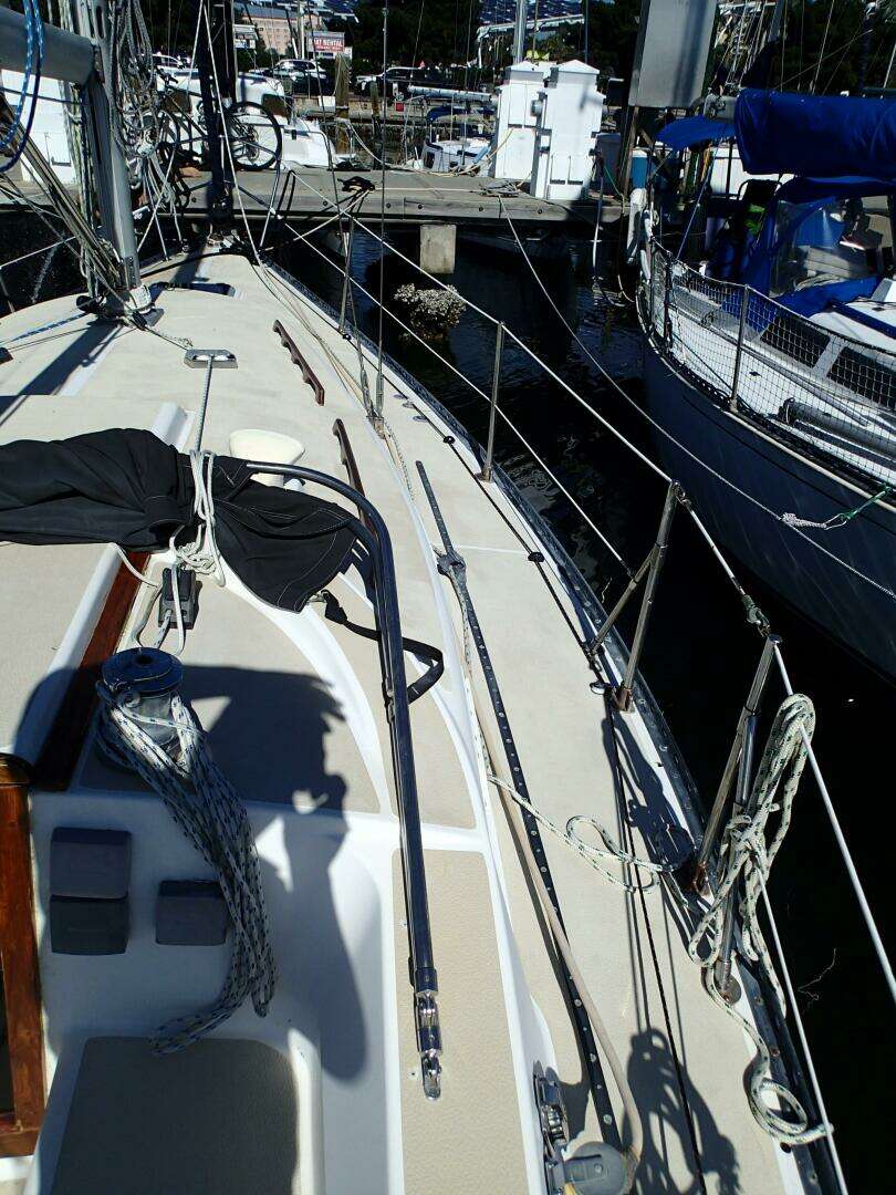 Wheel Steering, running rigging and lines led to the cockpit along with self tailing winch upgrades. Also electronics have been added and are modern. The traveler spans the cockpit just fore of the wheel, and it's well positioned for efficient sheeting. The fractionally rigged mast has double spreaders along with nice wide side decks with molded nonskid from the Tartan production.