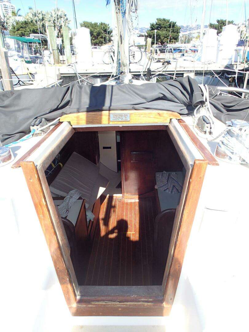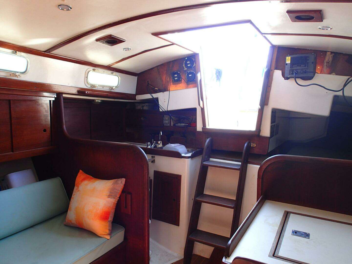 The boat is ideal for a couple or a small family! With galley to starboard as you descend the ladder. It has a large sink and, icebox on the port side fore of the Navigation station. The Nav station includes a good-sized chart desk. There is a quarter berth aft of the nav station. The salon includes facing settees with updated upholstry. Eight opening portholes generates exceptional cross ventilation. As you move forward the head spans the width of boat just fore of the mast with doors to both the salon and forward cabin. The forward cabin includes a roomy V berth, a large hanging locker with a couple of drawers.