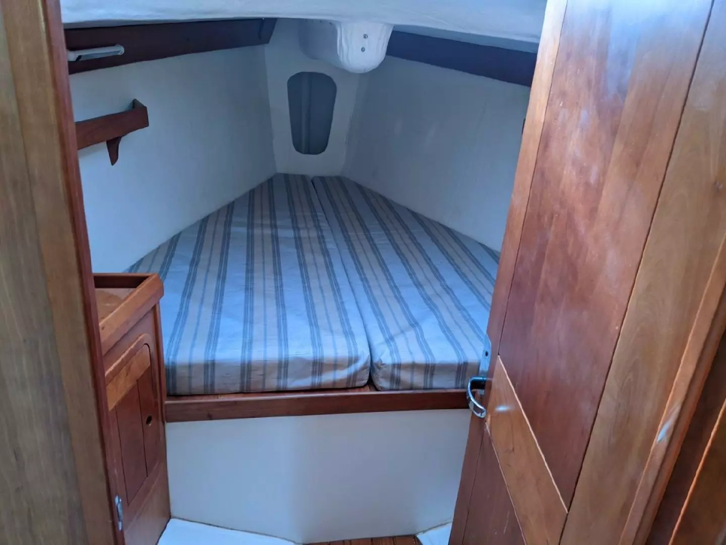 - Vee berth forward, with hanging locker, storage cbinet, storage under vee. hull side storage shelves.