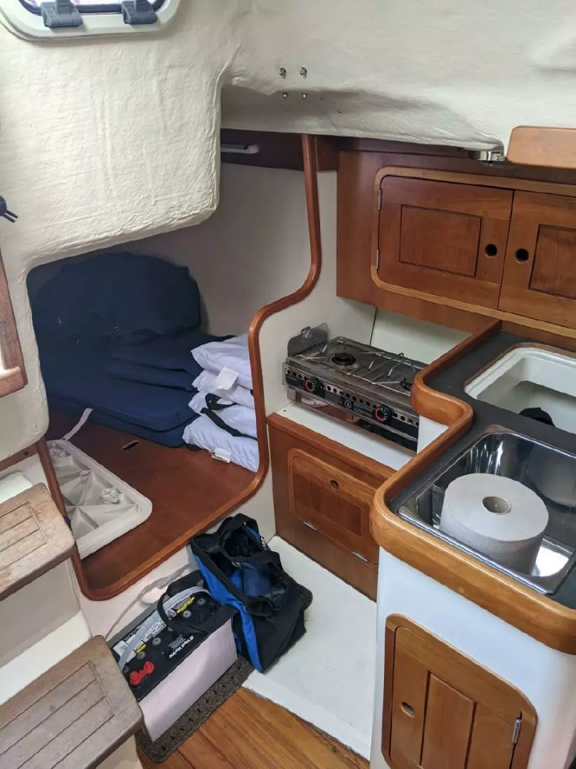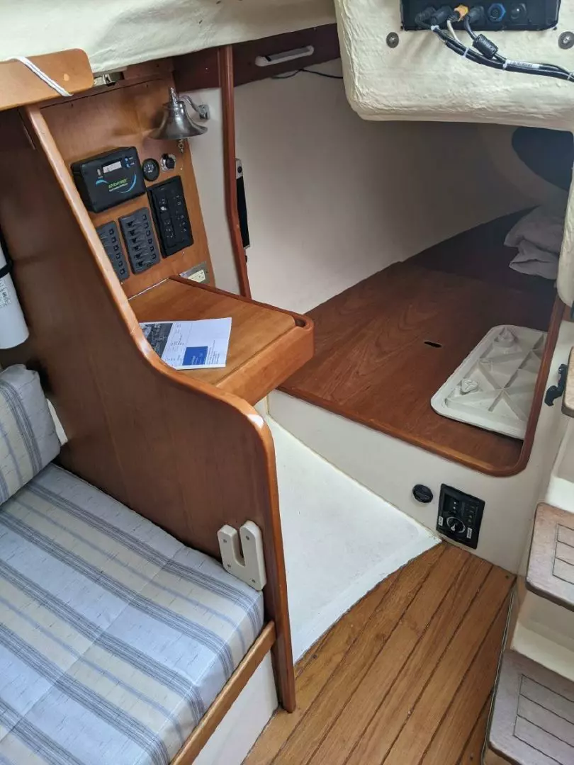 - Cavernous, yet tidy interior enabled by the hull’s ~11’ beam and an open, opposing settee layout with removable table. Settees are set up to serve as sea berths, with lee boards and cloths