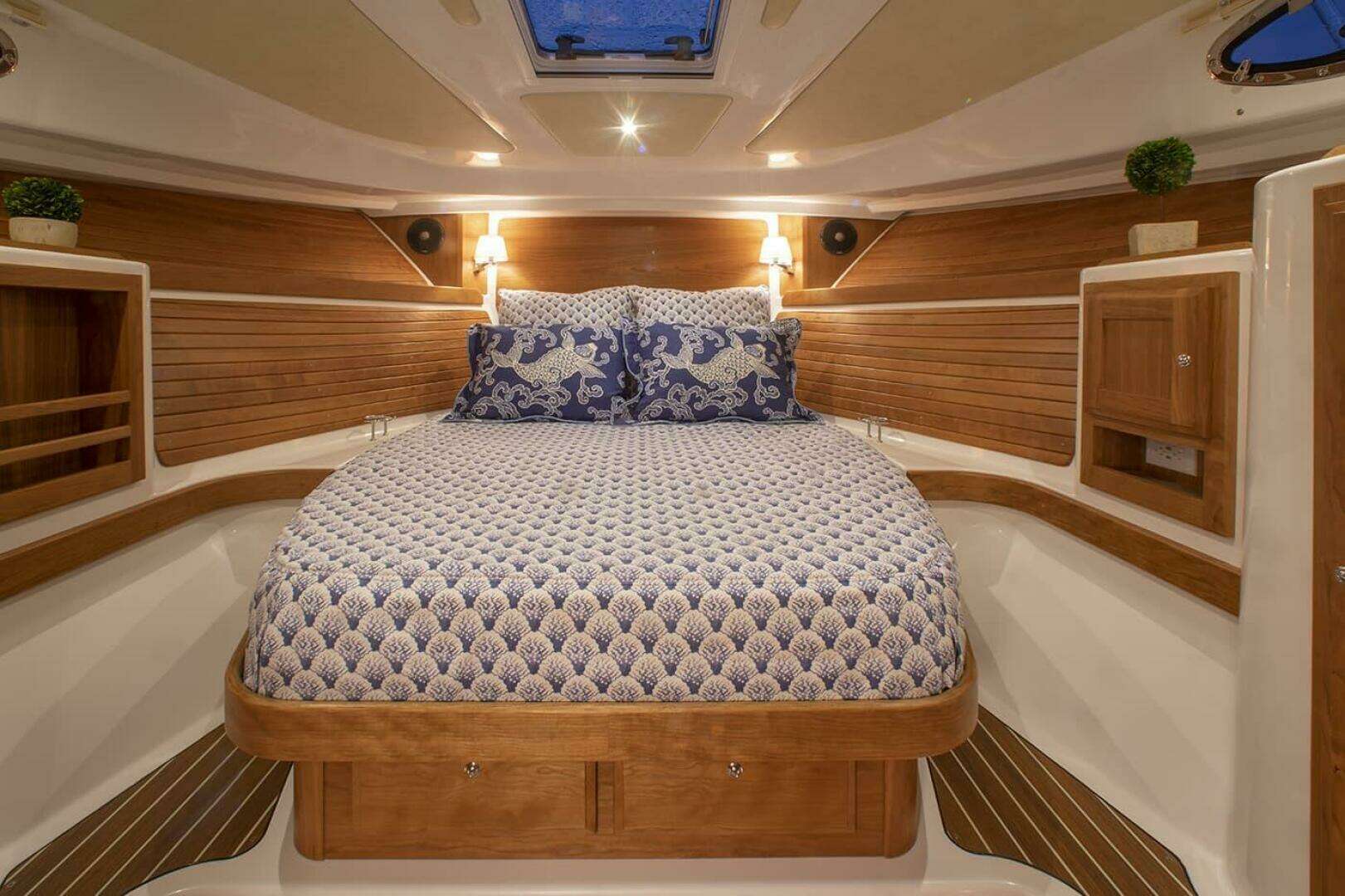 Below deck, the Back Cove 34O offers a comfortable queen-sized island berth outfitted with storage drawers and spacious outboard shelves. Aft of the berth, she features a split head and shower unit that ensures her owners are comfortable no matter how long their journey. Extra provisions, water toys, and other accouterments will find their perfect home in the Back Cove 34O?s sizable storage space, conveniently located beneath the salon sole.