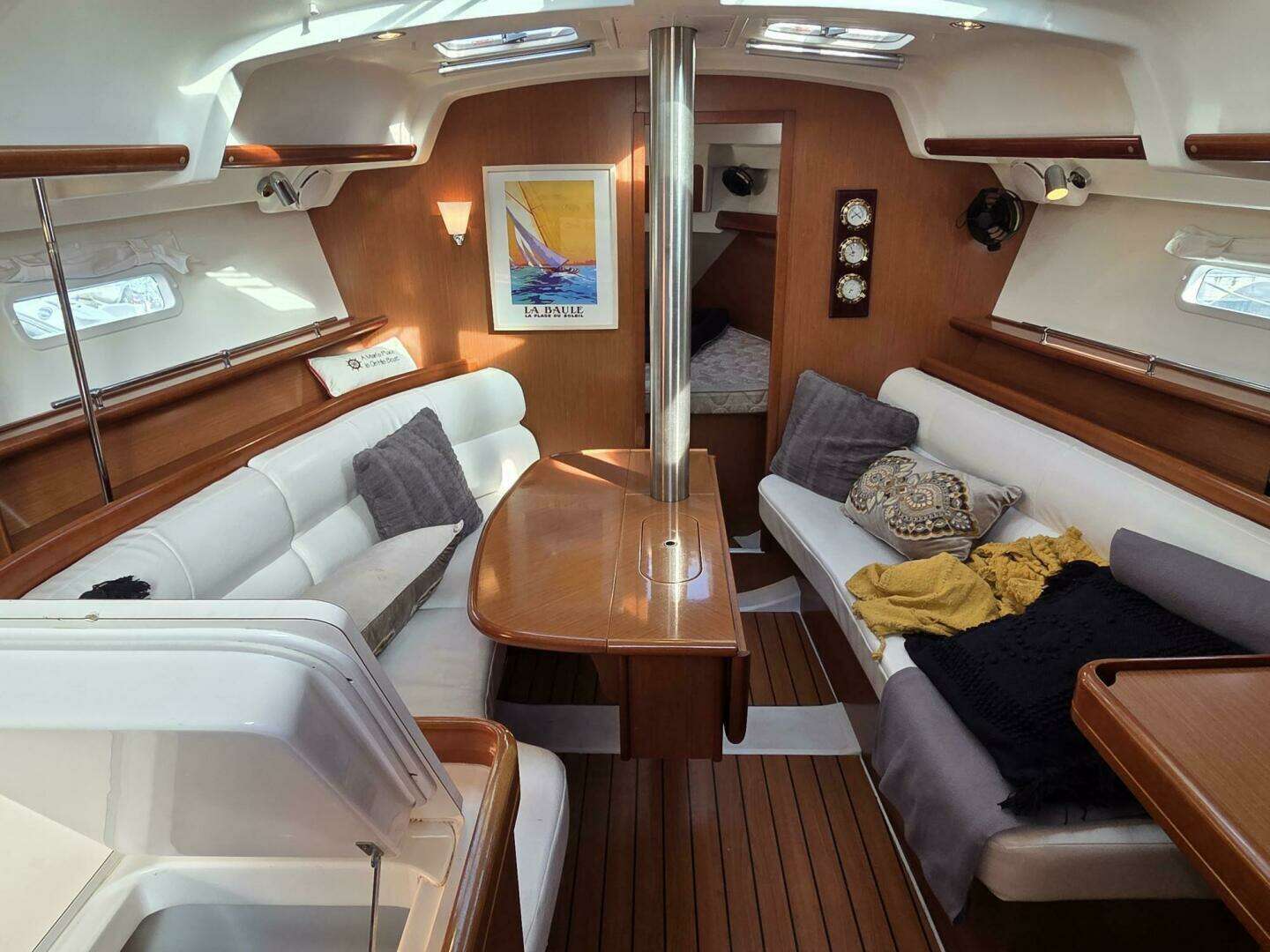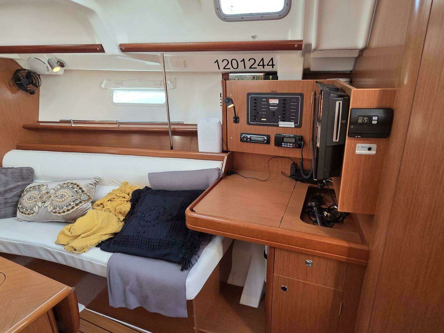 The salon features an L-shaped dinette to port and a settee and the nav station to starboard. The centrally-mounted table has drop-down leaves on both sides. Just aft of the head is the nav station with A/C and D/C panels, control for the Webasto diesel heat system, VHF, and a flat panel TV.