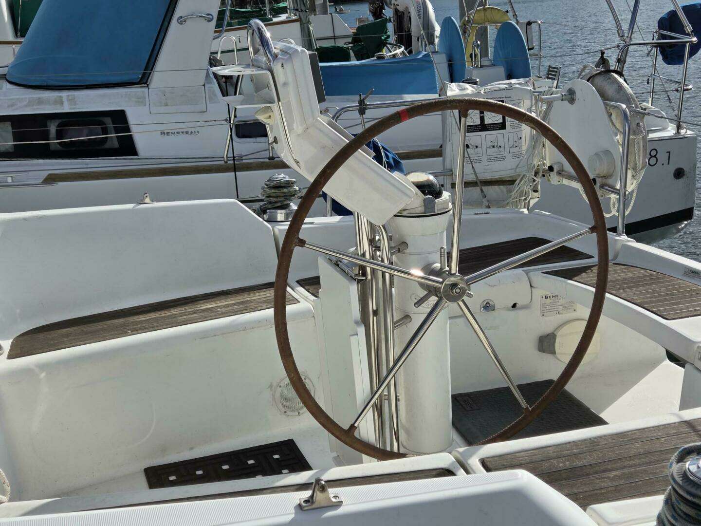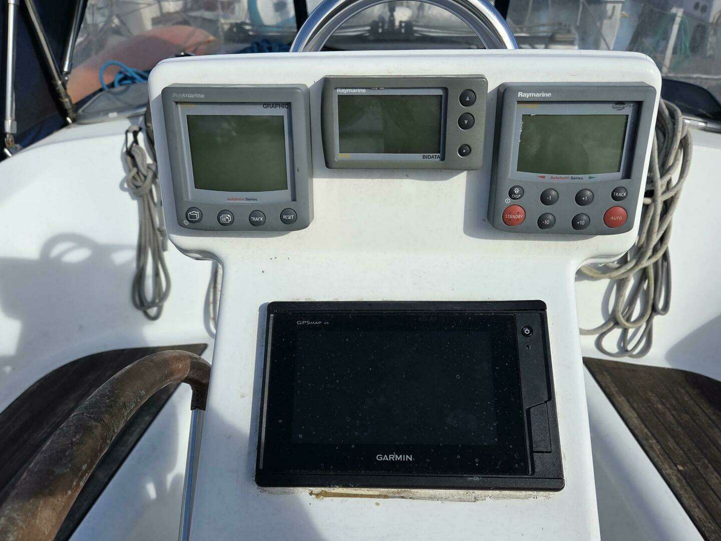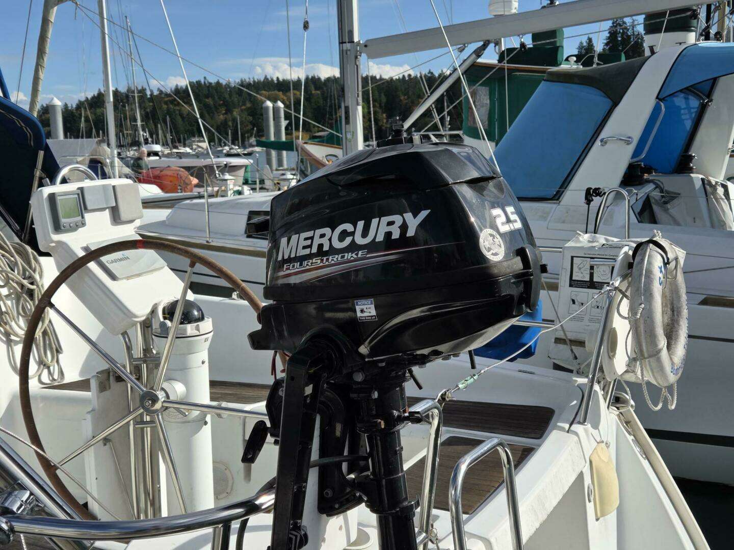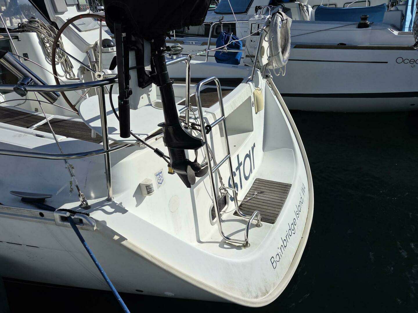 Sail inventory includes a full-batten main with stack pack and furling jib, with all lines led aft for easy short-handed sailing. Electronics consist of a Raymarine multi-function display, autopilot, and Garmin chart plotter. The cockpit is spacious and practical, featuring a pivoting wheel that allows clear access through the walk-through transom. Star also includes an inflatable dinghy and Mercury 2.5hp outboard.