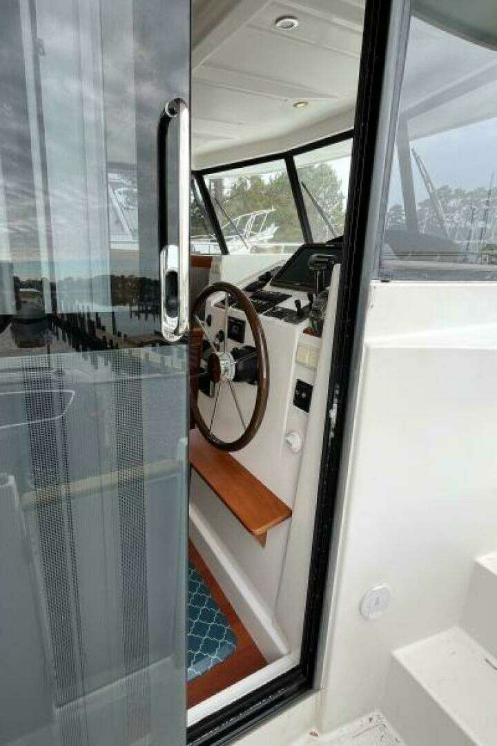 The interior is light, with 360 degree visibility, thanks to windows all round. The windscreens each have a large wiper to keep them clear in inclement conditions. There is plenty of room to move about in the salon and the accommodations up forward are extremely comfortable, with an enormous owner's cabin, a head and a bunk cabin. The salon also has a very comfortable sleeper couch for two and allows easy flow from the decks to the interior as well as access to the engine compartment via a hinged hatch in the floor.