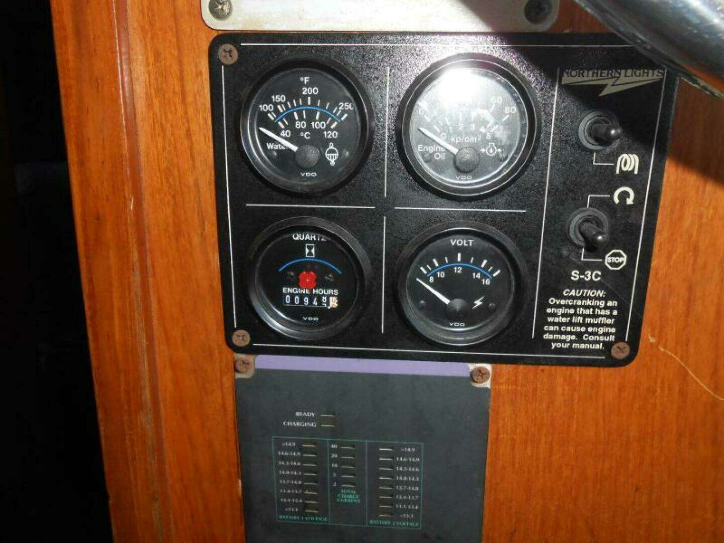 Vinyl headliner, varnished teak joinery, artistic carvings, and teak parquet cabin soles. 6'4" headroom.