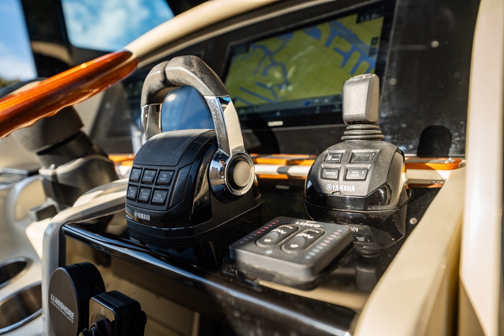 - Helm station: Features triple helm seats with flip-up bolsters and armrests for maximum comfort. The mahogany tilt steering wheel adds a touch of classic elegance.