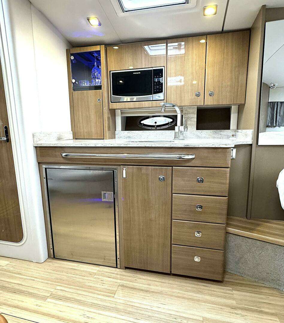 · Complete galley in high-gloss finish w/storage and hardwood dovetailed drawers, full Corian countertop, beverage center, polished stainless-steel sink, concealed 2-burner electric stove w/safety shut-off switch, 120V/12V stainless steel refrigerator, microwave oven & concealed in-counter trash container