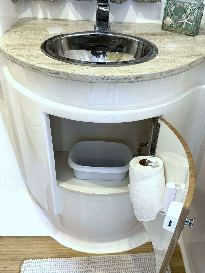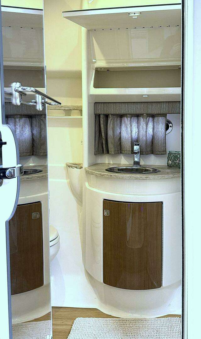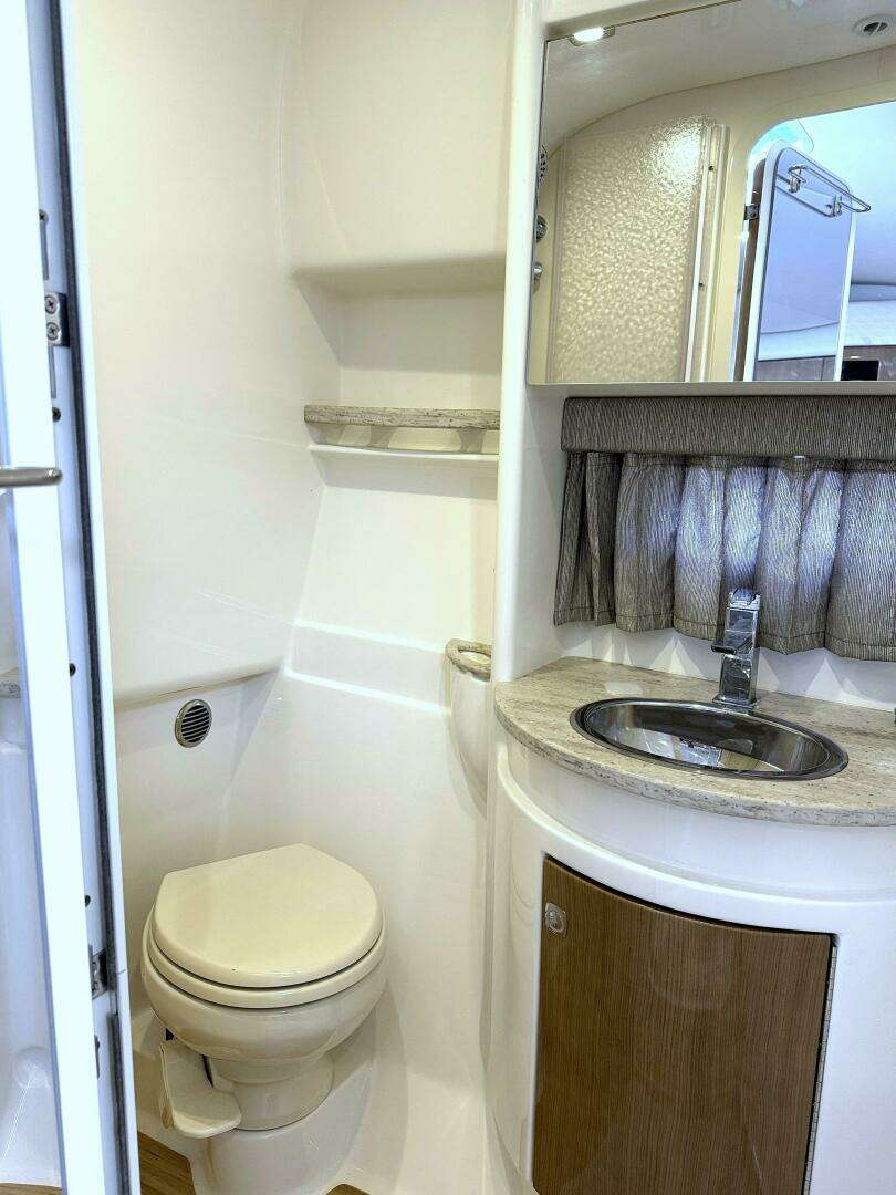 · Molded private head compartment w/molded vanity, lower doors in high-gloss finish, Corian counter, polished stainless steel sink w/swivel faucet, VacuFlush® unit w/holding tank & dockside pump out, separate stall shower w/hinged acrylic door & exhaust fan