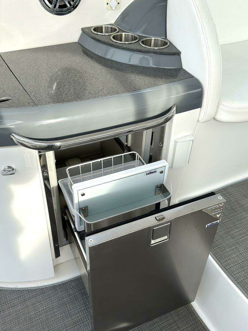 From the moment you step into the cockpit, you’re greeted by premium finishes—PreFixx® coated, weather-resistant seating, custom patterned carpet, and a molded wet bar with Corian® countertops. The spacious layout offers twin command seating, a U-shaped lounge, and a convertible sunpad, making it perfect for entertaining family and friends.