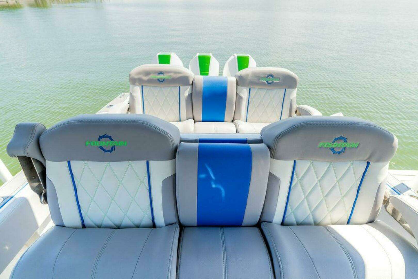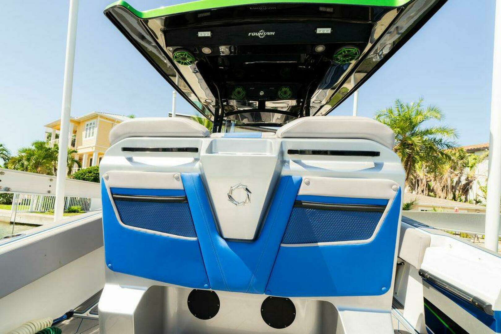 From the stand-up bolsters and full-width aft seating to the forward chaise lounges and recessed bow seating, the Fountain 34SC blends offshore capability with luxurious comfort. With its sleek styling, triple-engine power, and class-leading ride, this 34SC is equally at home running 70+ mph offshore as it is entertaining friends in the harbor.
