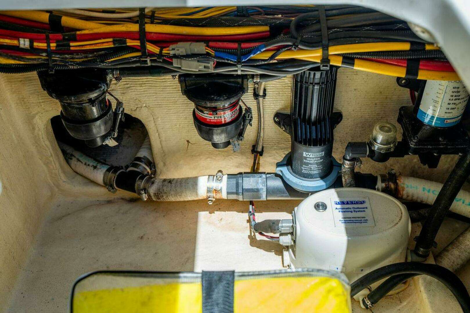 Storage Boxes (5) - Below Deck, with Overboard Diaphragm Discharge Pumps T-Top - Fiberglass, Overhead Storage -TopHiberglass, Ovemead storage T-Top Support Frame - Custom Welded Aluminum