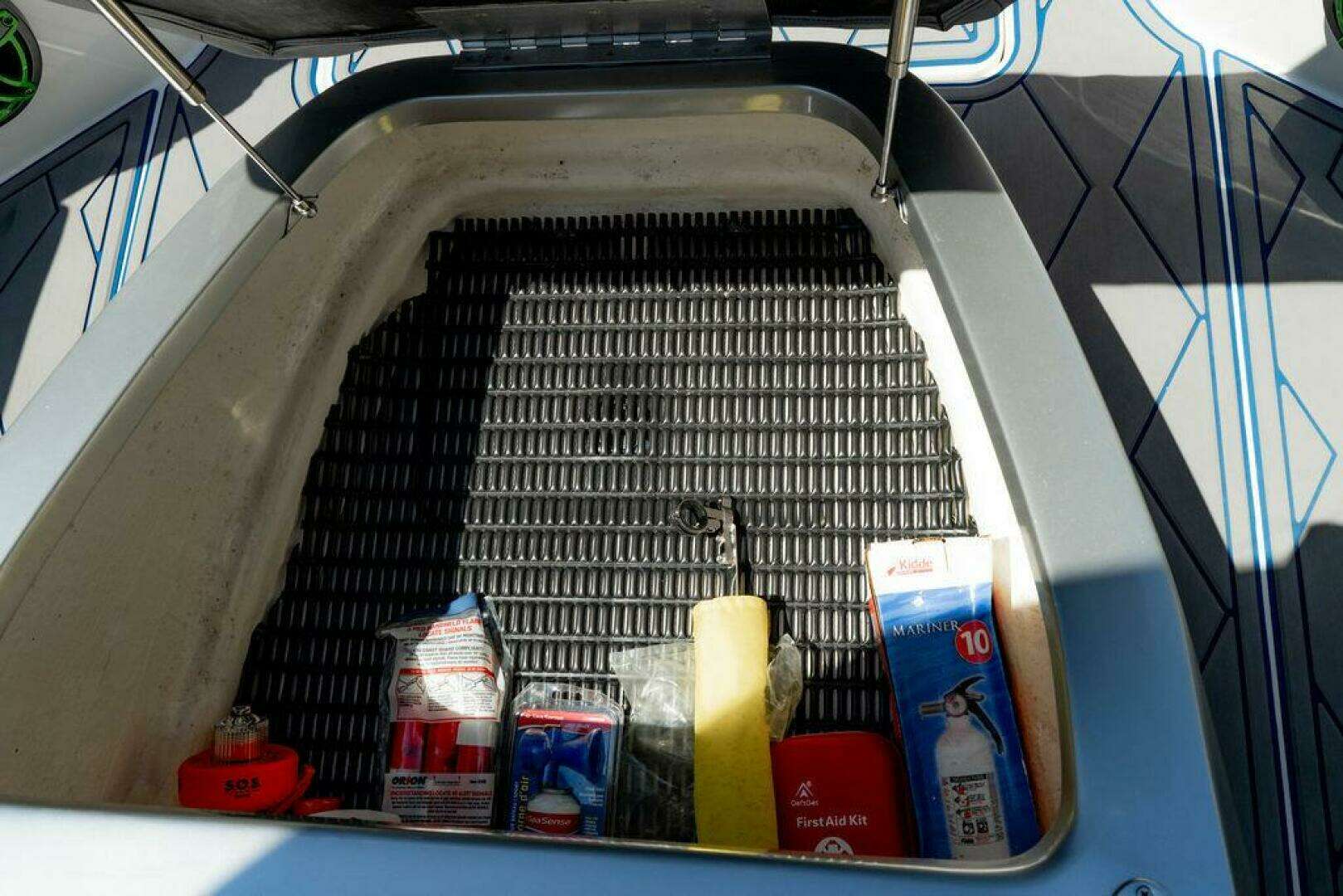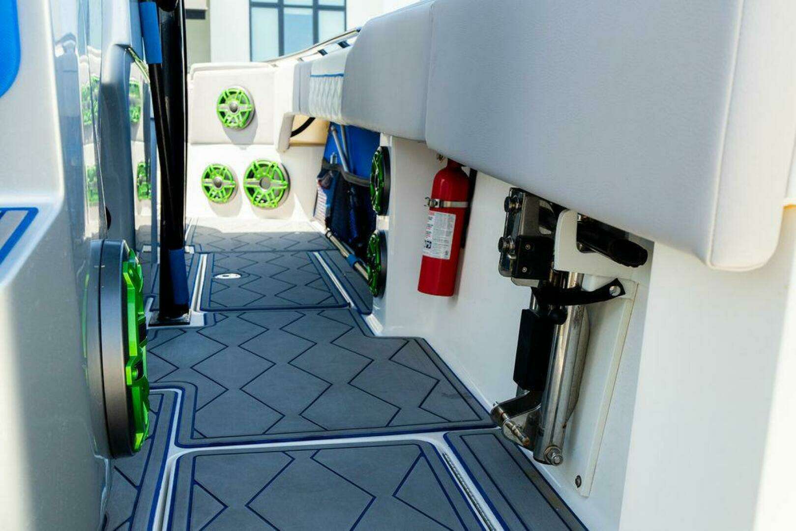 Chaise Lounge Console Seat - Forward, Double Wide, Articulating Arm Rests, Drink Holders Fish and Storage Boxes (5) - Below Deck, with Overboard Diaphragm Discharge Pumps Flooring - Color-Coordinated, Cockpit Sole, Deck Walkaround, T-Top Mat with Logo