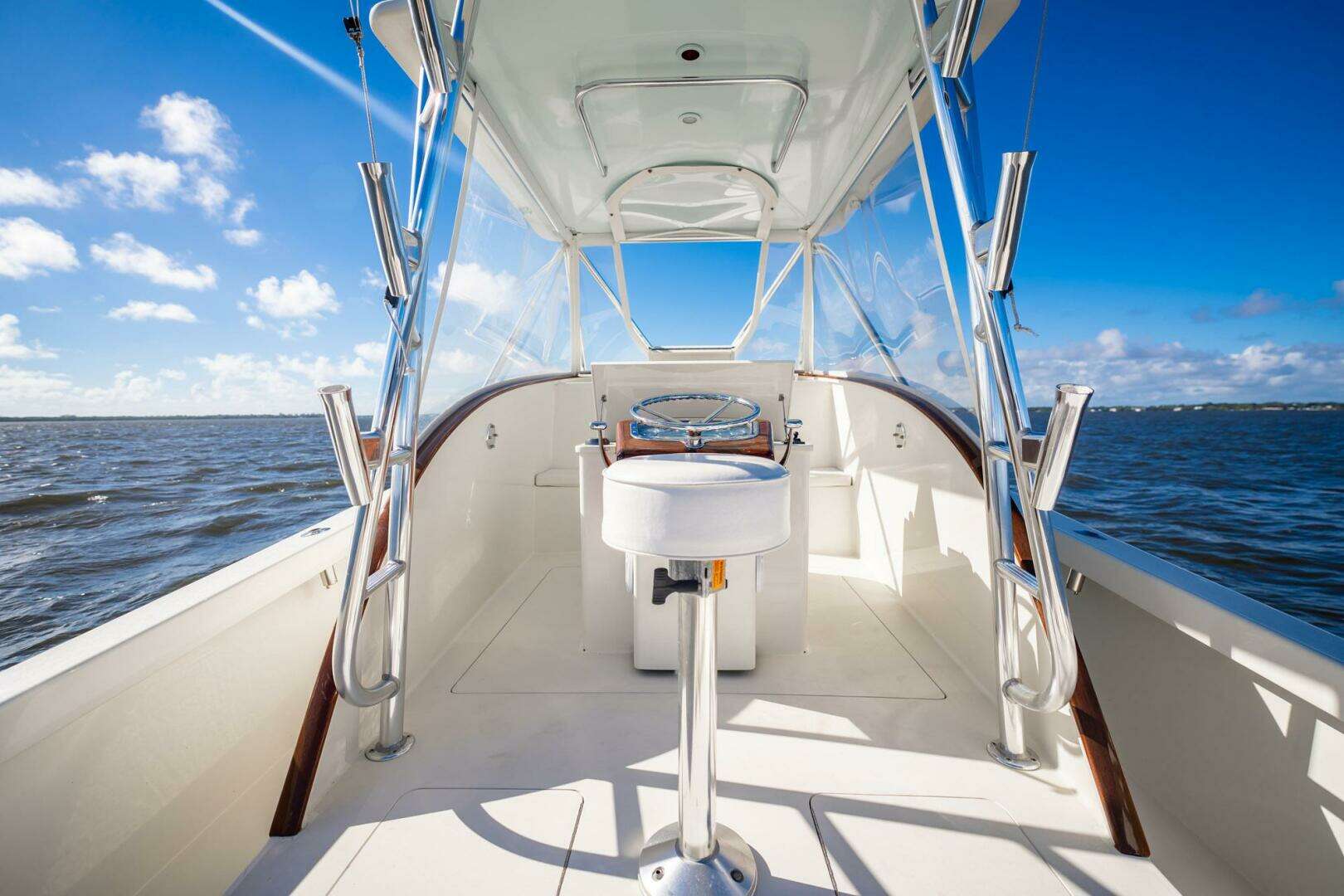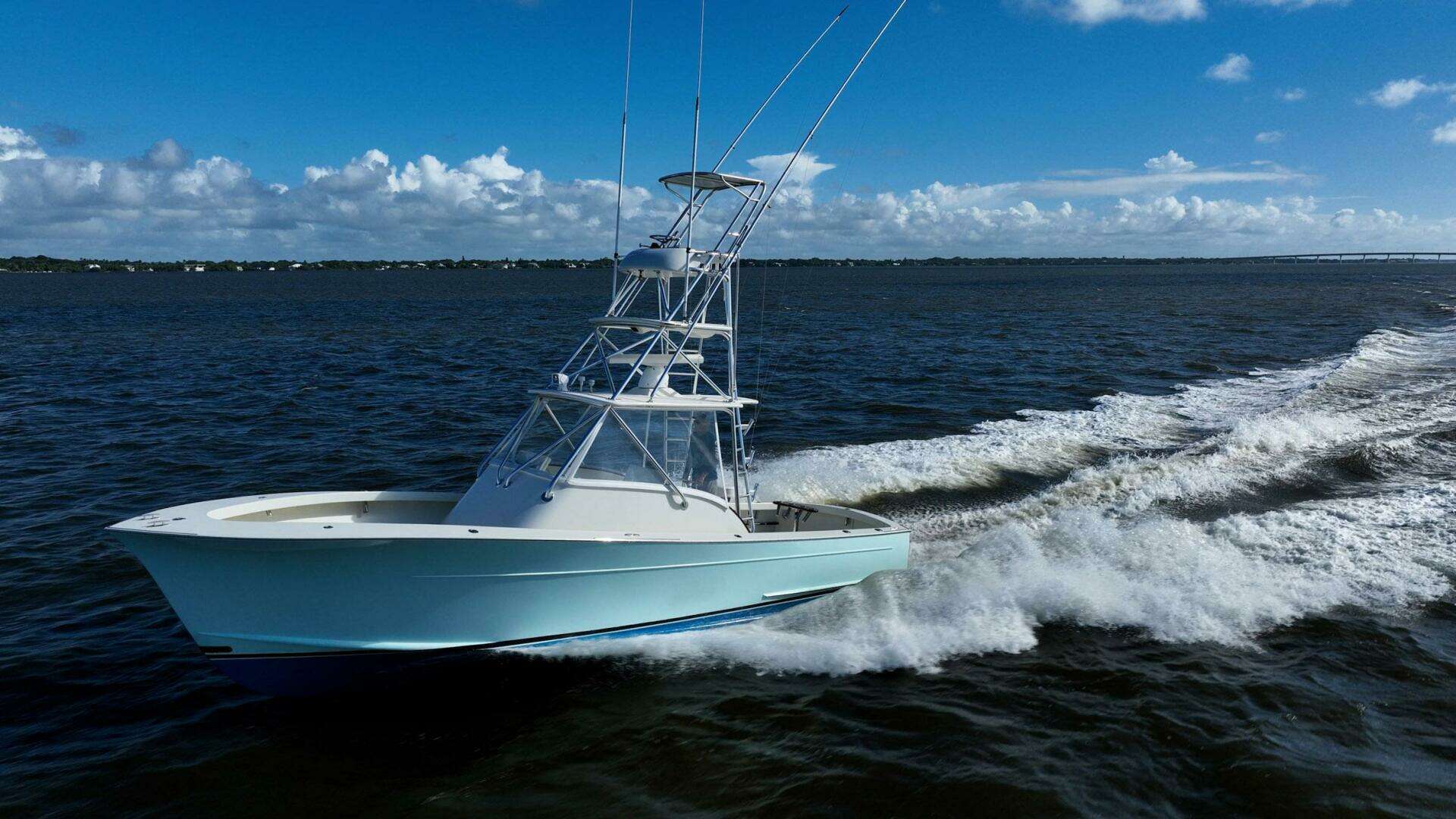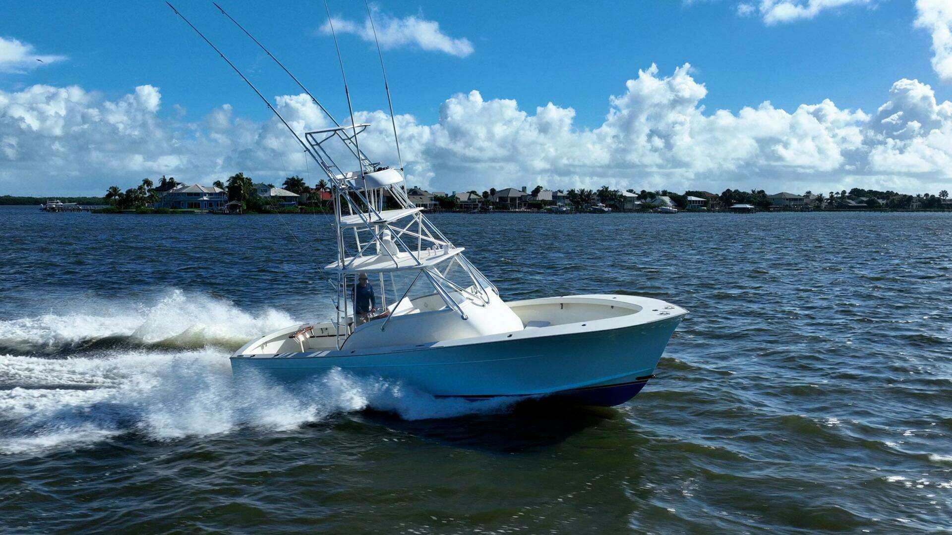 The Gamefisherman 34 walk-around is cold-molded and Awlgrip-painted throughout. It has varnished mahogany trim and a teak transom. The bridge has port- and starboard-side seats with a centerline helm. The varnished mahogany helm has a custom steering wheel, control handles, and engine instrumentation. Access to the engine room from the bridge is through large service hatches over the engines. The cockpit has insulated cabinets for drinks and bait, as well as a fresh and saltwater washdown system. The cabin has a stainless steel sink, a chrome faucet, lower berths, a hanging locker, a toilet and waste tank, drawers, and storage—a great opportunity to acquire a turn-key vessel.