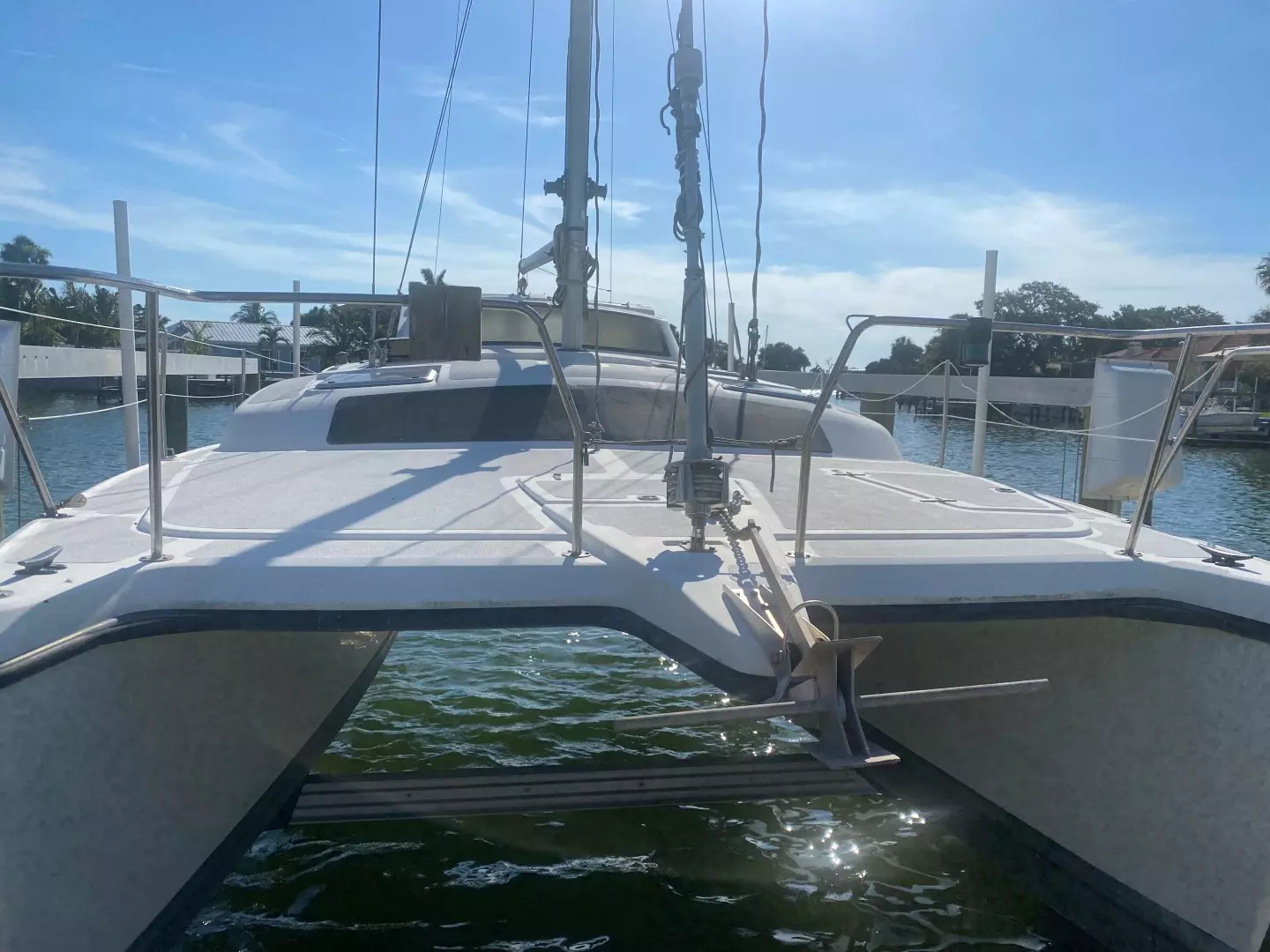 Bay Queen is a catamaran sailboat designed by Tony Smith. The large cabin provides room for comfortable cruising while the narrow beam allows access to standard marina slips. This boat shows the signs of years of sailing and exposure to the elements. It needs updating and TLC.