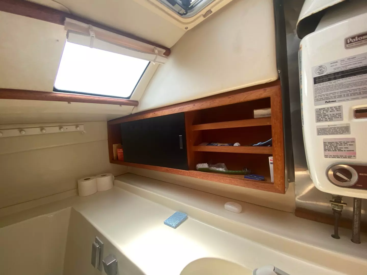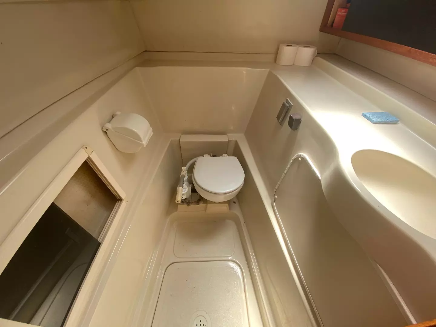 - Head: Manual toilet in large head compartment forward in port hull