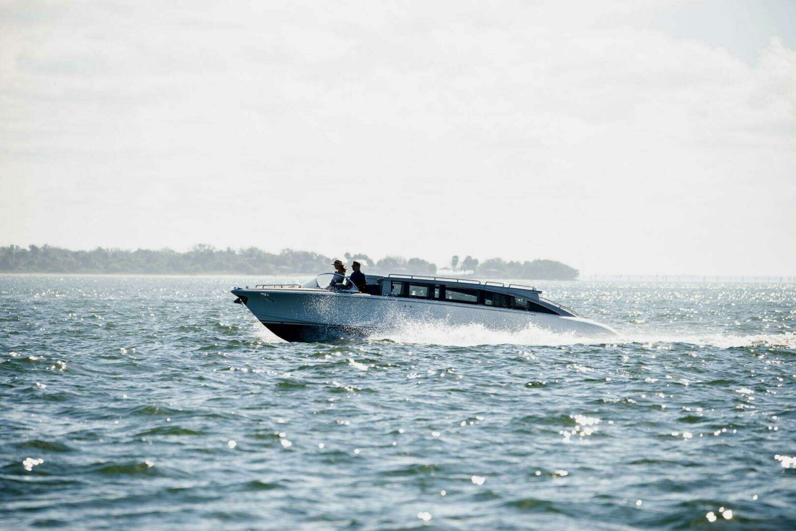 Built to the highest standards by Hodgdon Yachts in Maine. She seats 11 guests in luxury with a 360-degree view when the hardtop is raised, equipped with a high-definition entertainment system, refrigerator, bar, and climate control. She exceeds speeds of 30 knots, offers sports car-like handling that is Rolls-Royce-esque, smooth, and quiet. The hull was designed by Michael Peters and the custom interior by Hodgdon Yachts.