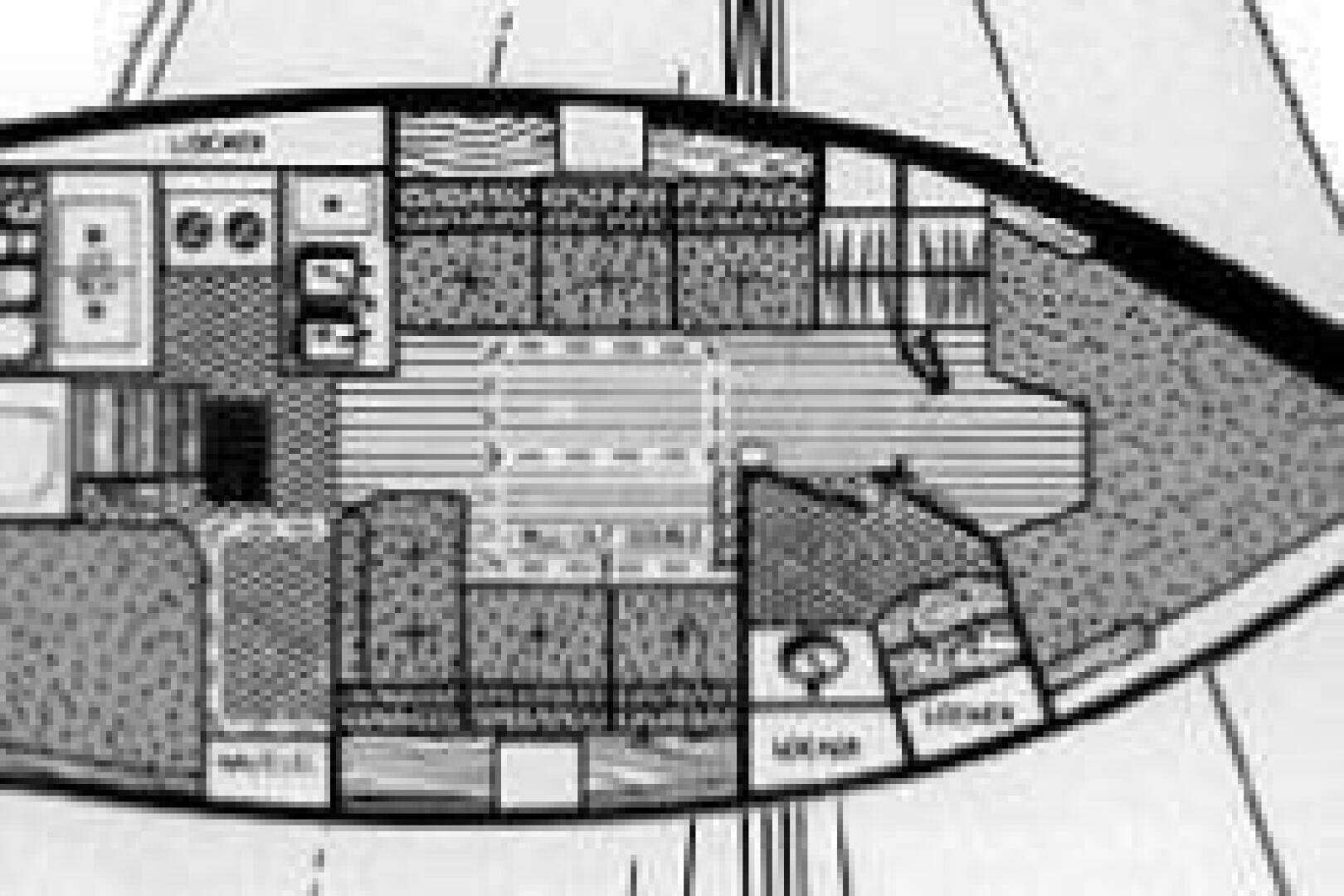 The aft starboard side features the Nav Station and large quarter berth. Port side aft is a nice U shaped galley with double sink with H/C pressurized water and sprayer (manual water pump is currently not hooked up) Outboard is a two burner propane stove and oven with large ice box aft. Interior is finished with teak bulkheads and trim. The varnished teak and holly floor is showing some old water stains but could be refinished or covered with a modern soft deck product.
