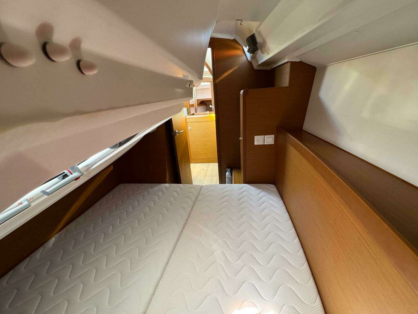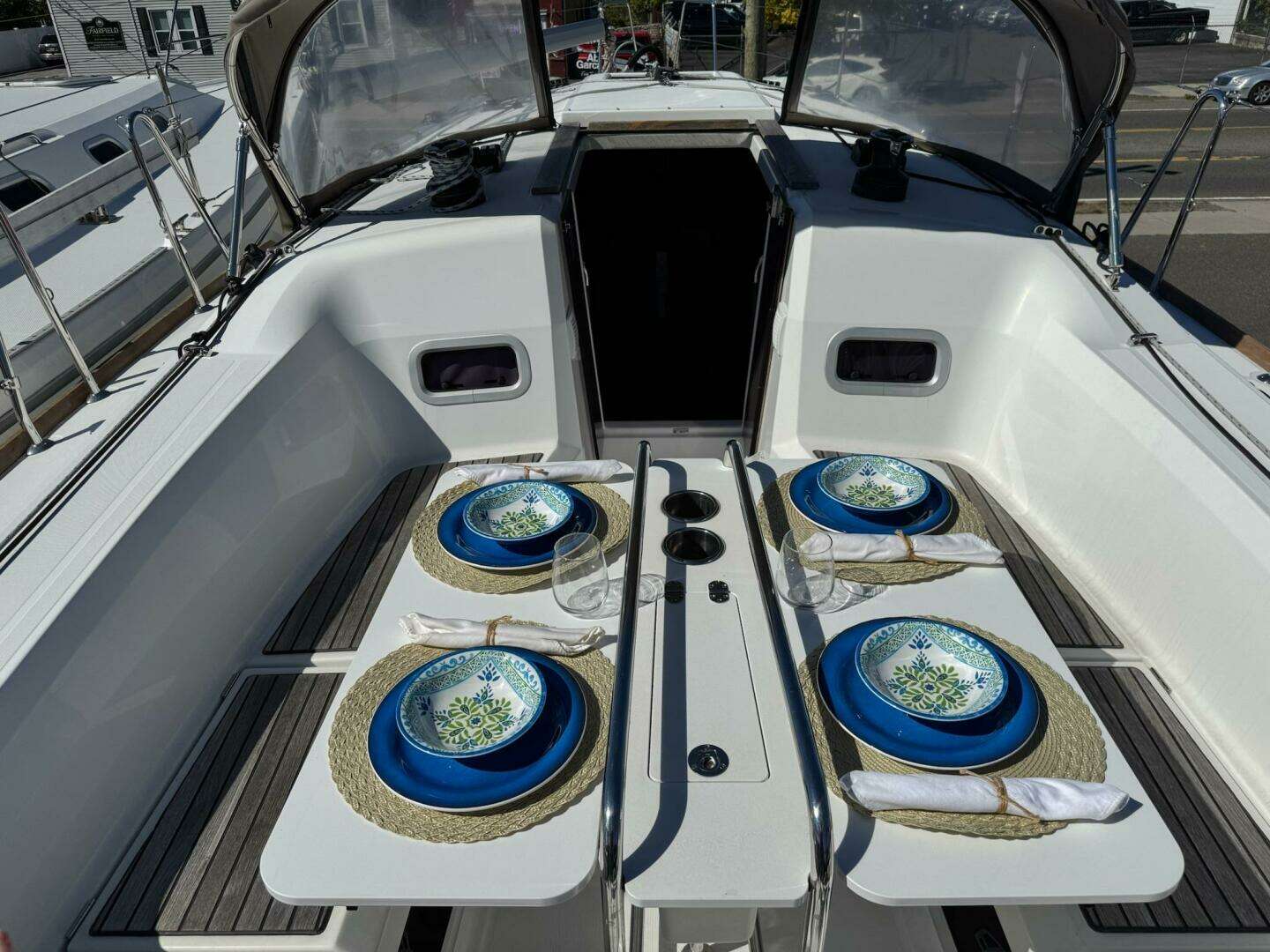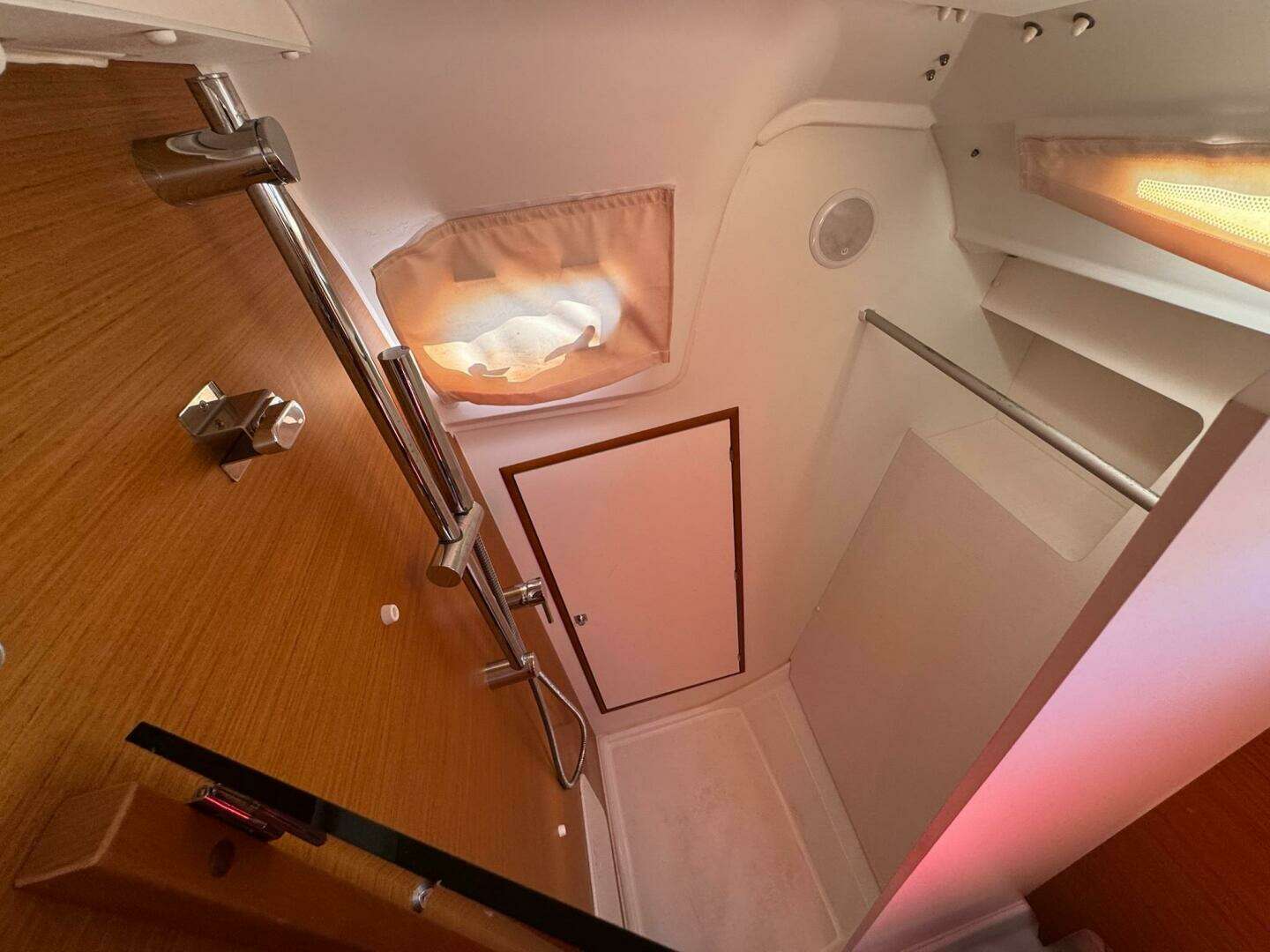 Flexofold prop, Cockpit dodger, bimini, connector, cockpit cushions. Fixed cockpit table, fold down swim platform with telescopic ladder, cockpit shower. Anchor, anchor well, electric anchor windlass.