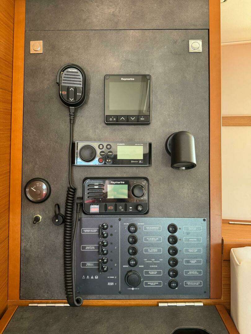 Raymarine I70s MFD at Chart table, Depth-Speed, Masthead Wind Sensor, Ray53 VHF, AIS 700 Raymarine Transceiver, ACU400 Core Unit & Gyrocompas, 2 GPS Raymarine Axiom 7 MFD, Autopilot Wireless Remote Control, Fusion Bluetooth radio, speakers
