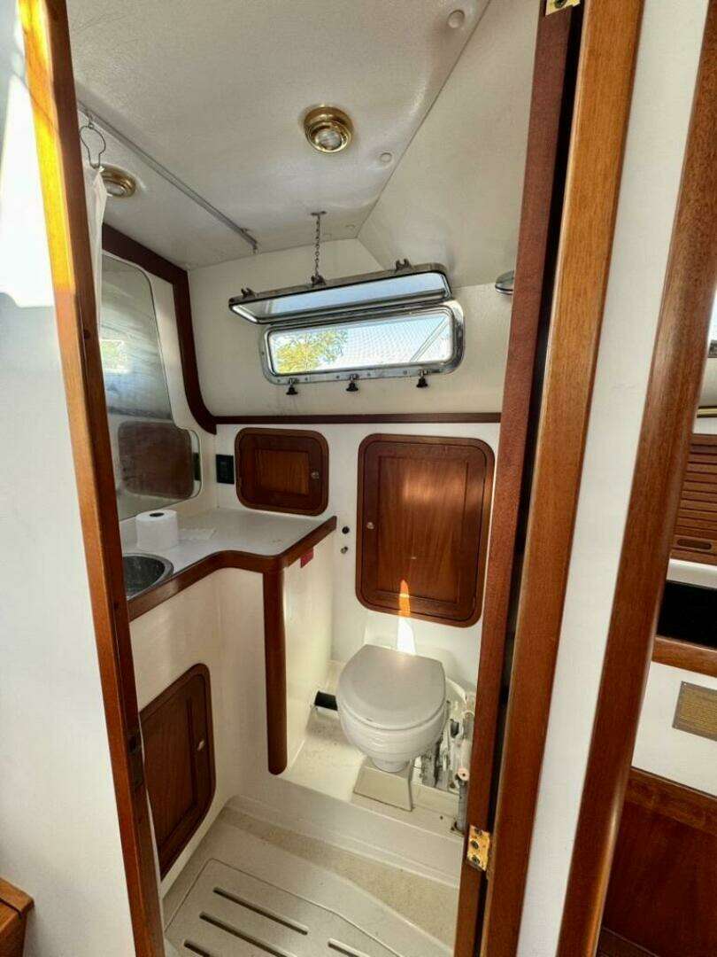 Below deck, the Legacy 34 Sport Express offers a warm and inviting interior finished with a traditional teak and cherry satin varnished interior. To starboard, an L-shaped settee provides a comfortable space for dining or relaxing, with the electrical panels conveniently located just outboard for easy access. The galley is compact yet well equipped, featuring all the essentials for cruising. Forward, a private cabin with a V-berth offers a cozy retreat and ample storage. The head includes a fresh-water toilet and shower. The entire cabin is climate-controlled with both heat and air conditioning for year-round comfort.