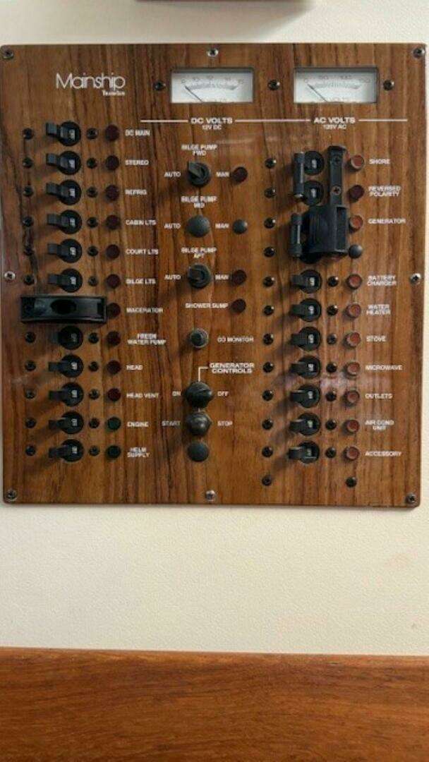 Providence is driven by a single Yanmar 6LYA-STE producing 370 horsepower, coupled to a direct-drive bronze propeller. Her proven performance includes efficient long-range cruising with confidence in a wide range of conditions. Electrical power is handled by a dual-battery setup with ProSeries charger, supported by a 5kW diesel generator for off-grid comfort. Shore power is 30-amp, making marina connections simple and reliable. Heating and cooling are provided by a 16,000 BTU reverse-cycle system that keeps the cabin comfortable year-round.