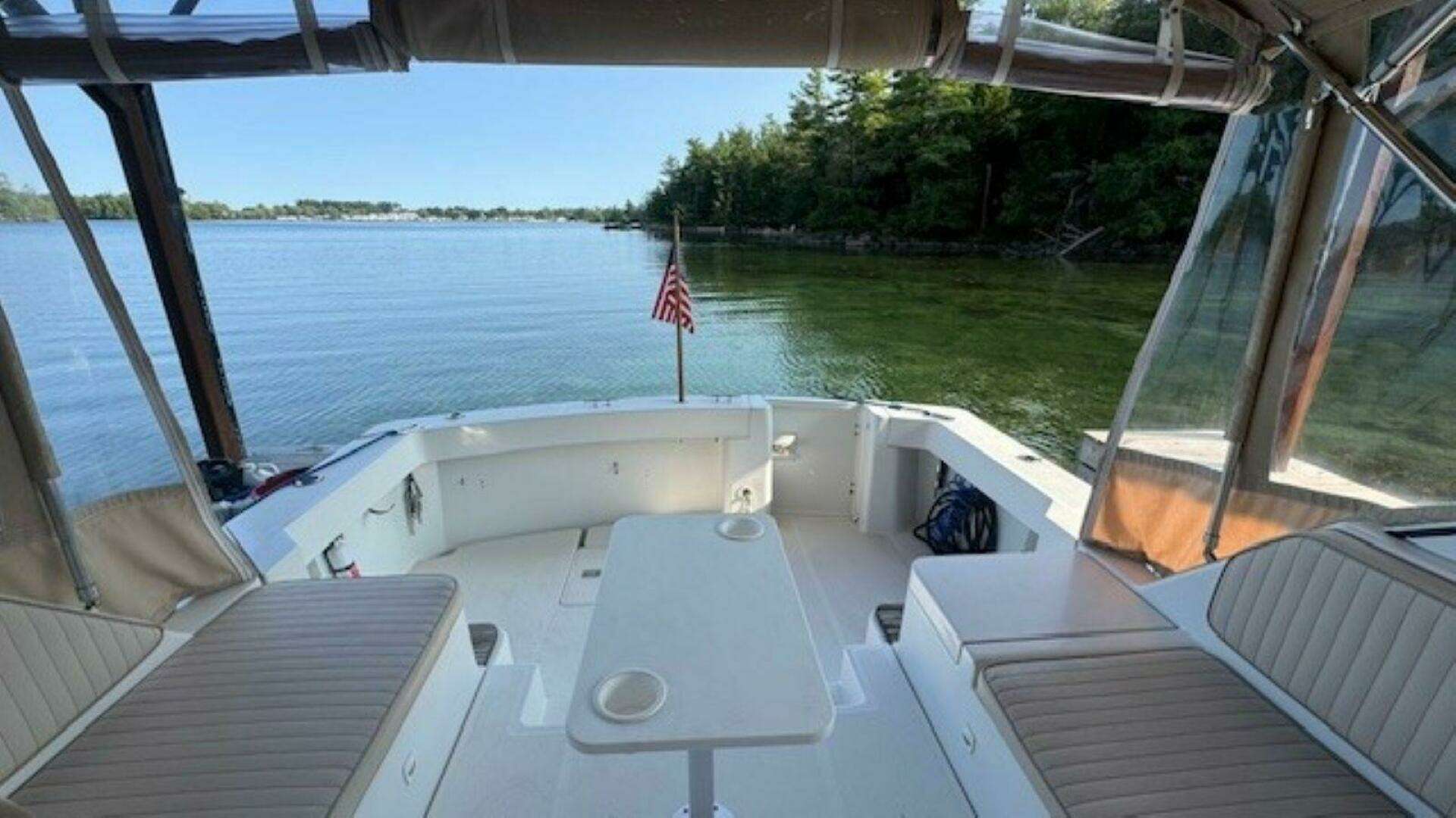 The helm is designed for visibility, comfort, and organization. Seating includes double-wide helm seats and additional bench seating with built-in storage lockers. A chart table and helm table provide space for navigation and planning, while cup holders and under-seat storage keep essentials close at hand. The Sunbrella canvas enclosure with screens was replaced in 2024 and allows the space to be enjoyed comfortably in a wide range of conditions.